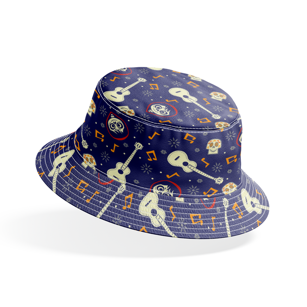 Coco navy blue musical pattern featuring guitars, sugar skulls, music notes and decorative motifs. Perfect for Day of the Dead celebrations or rock music fans.