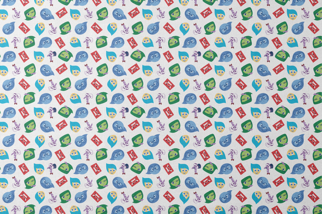 Inside Out pattern featuring animated emotions with expressive faces in blue, green, red, and purple shapes. Perfect for fans of the Pixar movie "Inside Out" and character-themed decor.