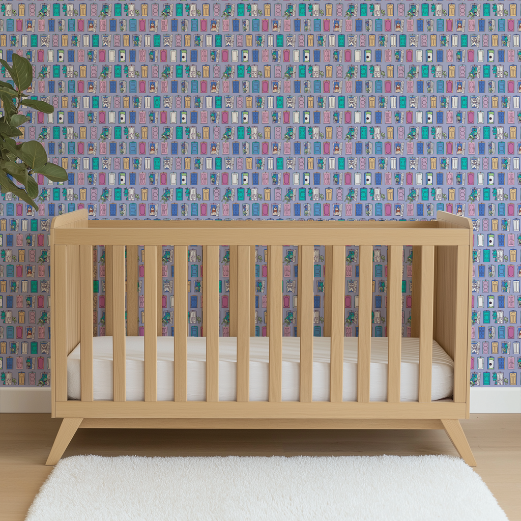 Playful monster-themed cartoon doors pattern in purple and pastels, perfect for children's room decor or sleepwear fabric with a whimsical nursery theme.