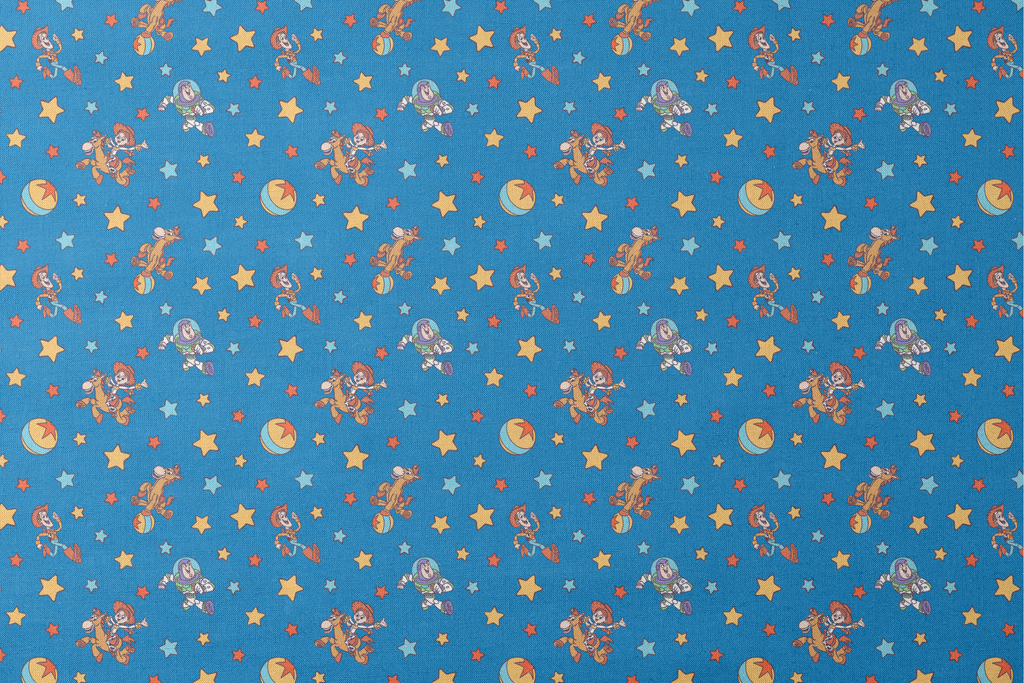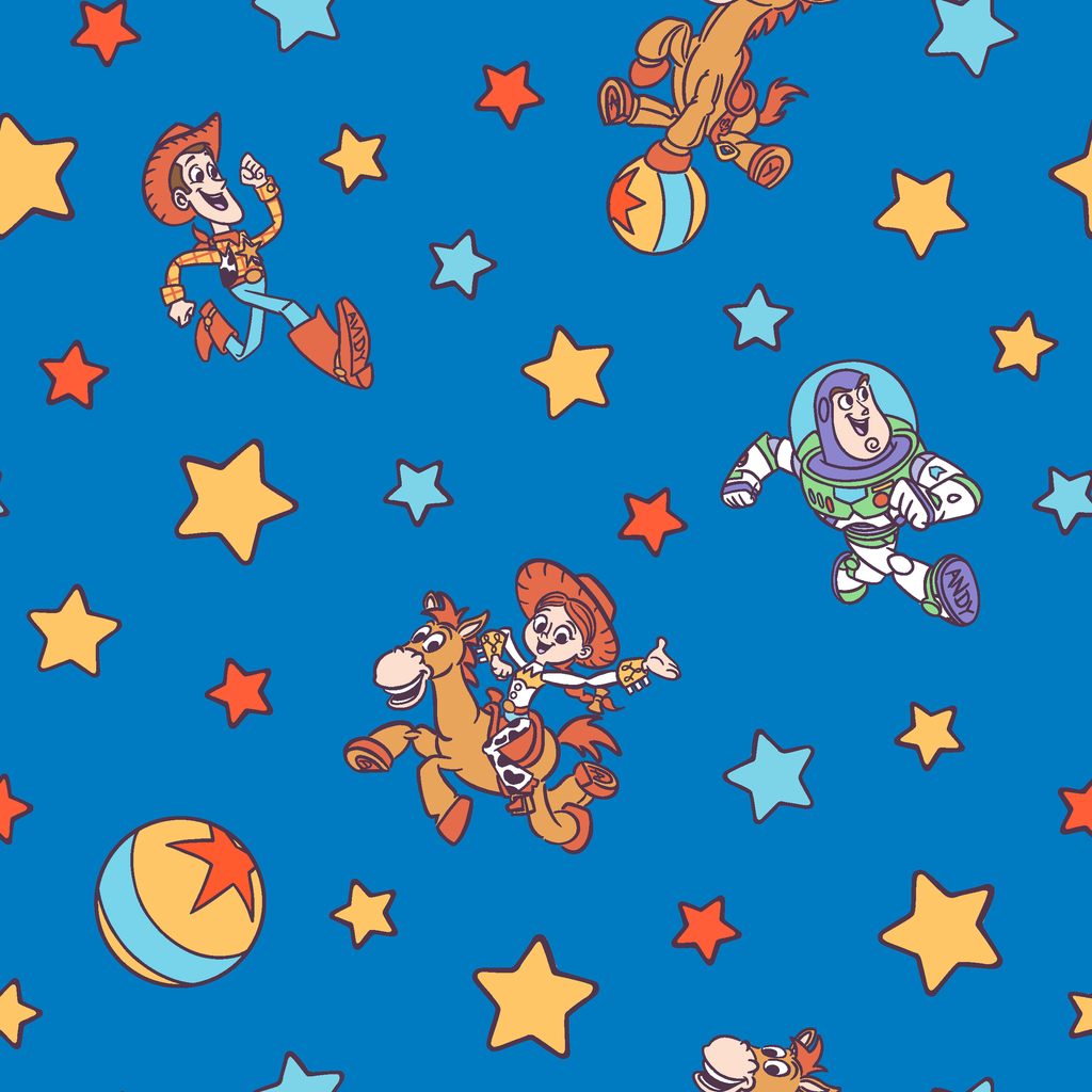 Officially licensed Disney and Pixar's Toy Story design featuring Woody, Buzz Lightyear, Jessie, and Bullseye floating among colorful stars and Pixar’s iconic Luxo Ball on a vibrant blue background. Perfect for playful projects and kids’ spaces. ©Disney/Pixar