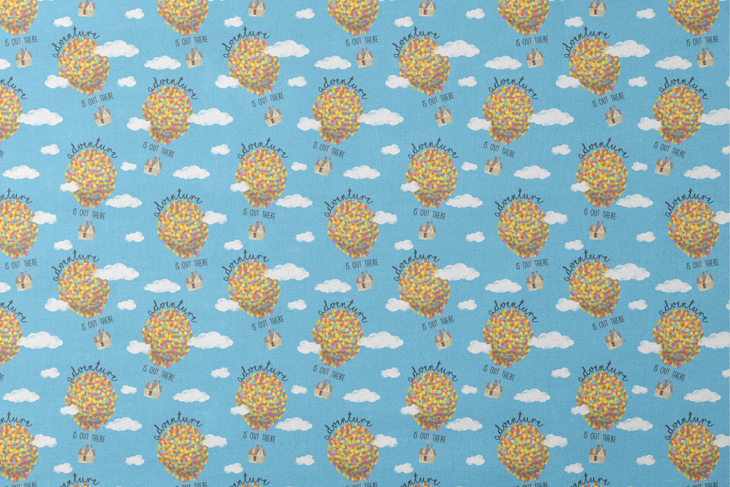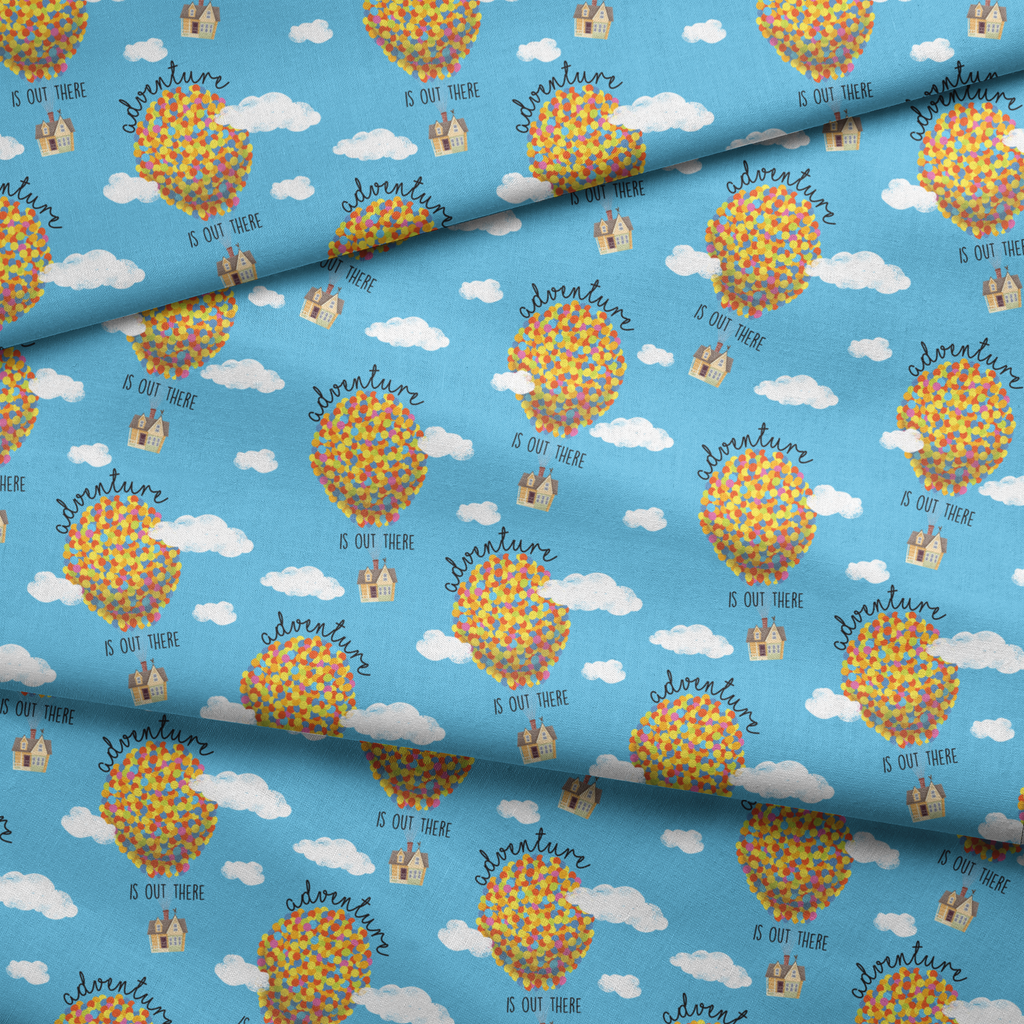 Colorful Up-inspired floating houses with balloon clusters on a bright blue sky background. Adventure-themed pattern with whimsical, cheerful elements perfect for children's home decor.