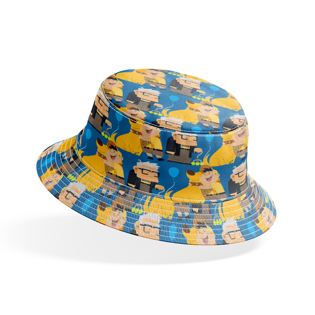 This whimsical cartoon pattern features characters from Disney Pixar's "Up" movie, including Carl, Russell, Dug the dog, and colorful balloons in a playful repeating design on blue background.