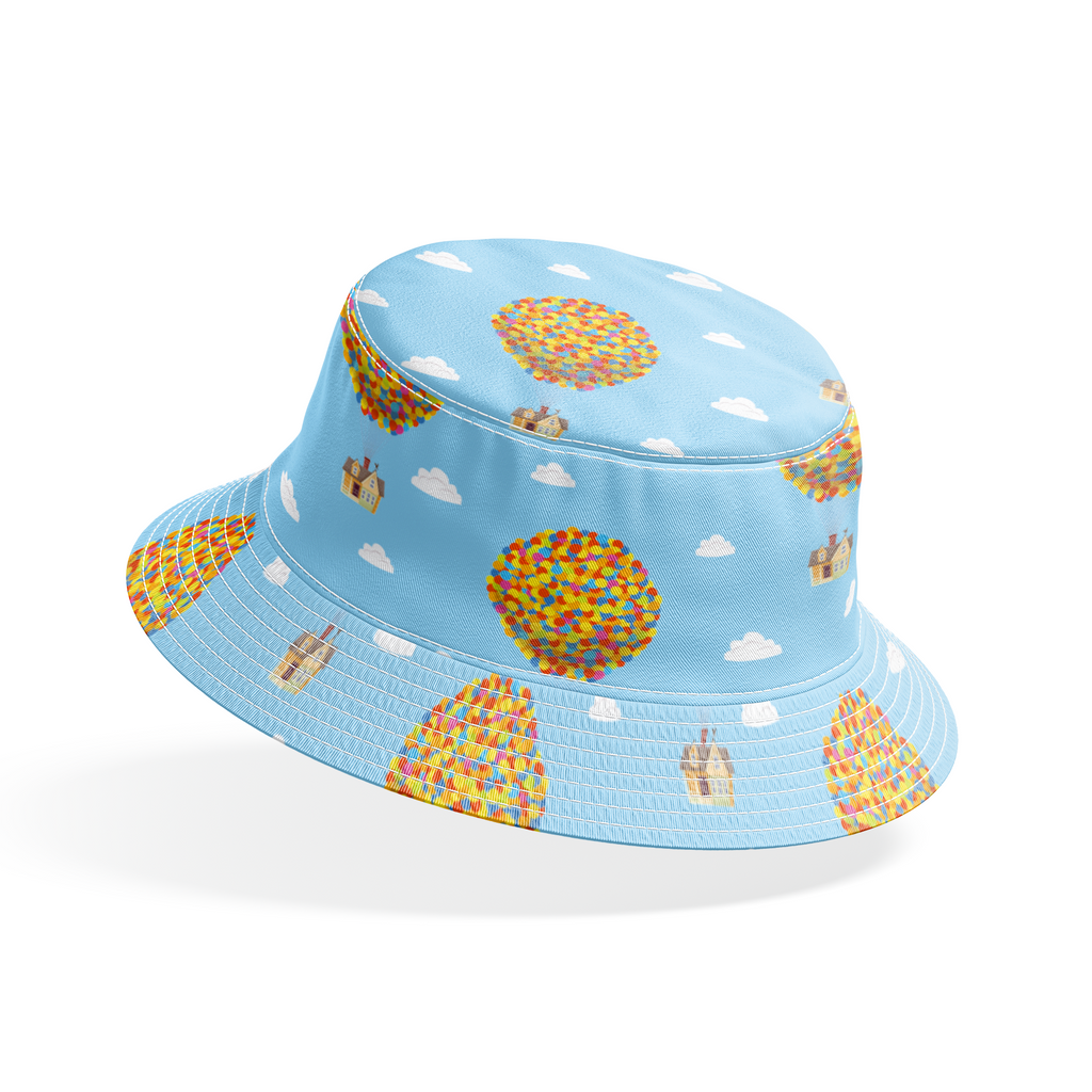 Up-inspired balloon houses float across a light blue sky in this playful pattern. Colorful bunches of balloons in rainbow hues carry tiny cottages through fluffy white clouds.
