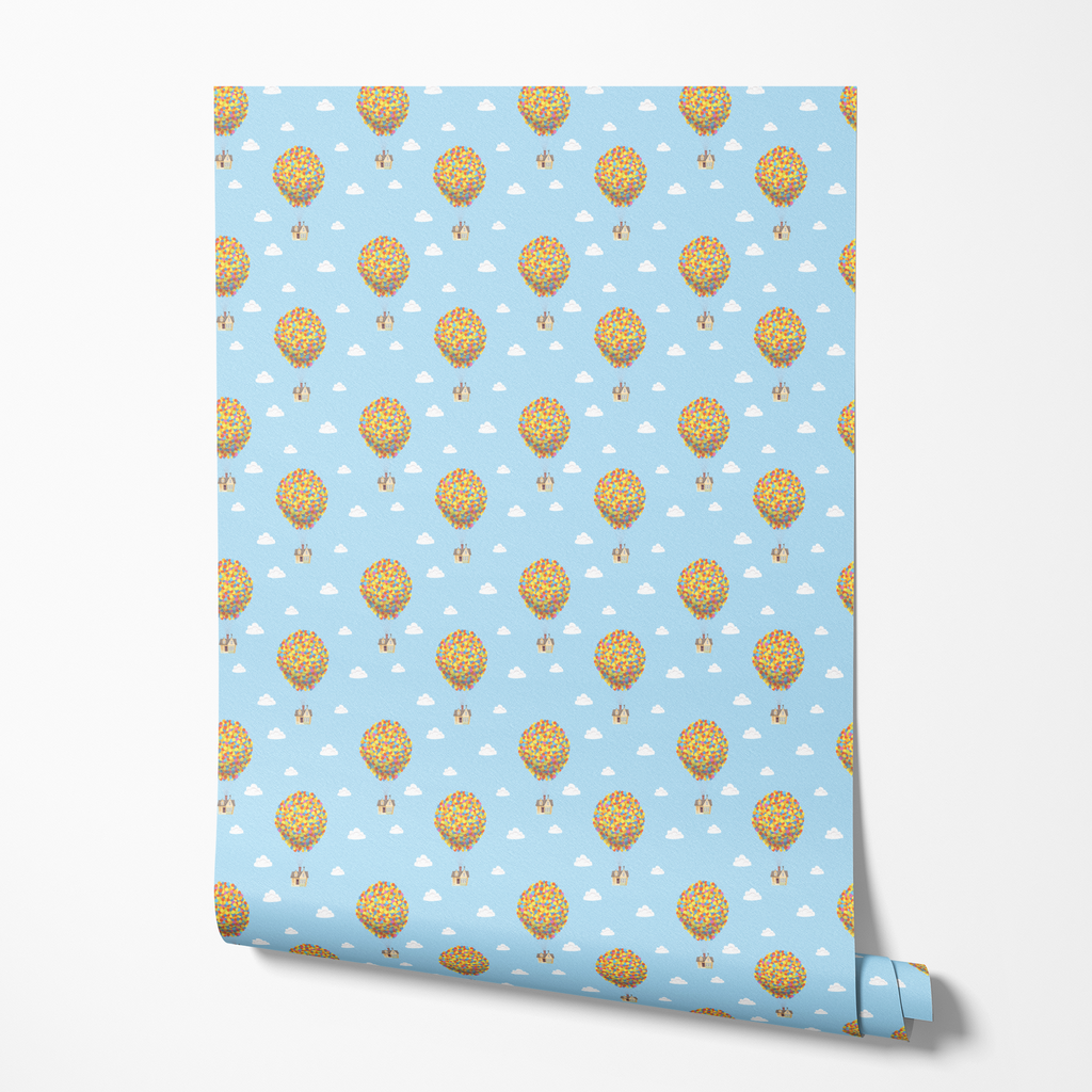 Up-inspired balloon houses float across a light blue sky in this playful pattern. Colorful bunches of balloons in rainbow hues carry tiny cottages through fluffy white clouds.