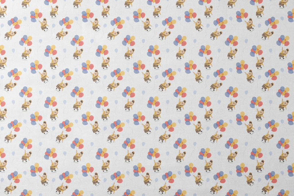 Whimsical Up-inspired colorful balloons lift cartoon characters in explorer outfits, creating a playful adventure pattern perfect for children's decor or party themes.