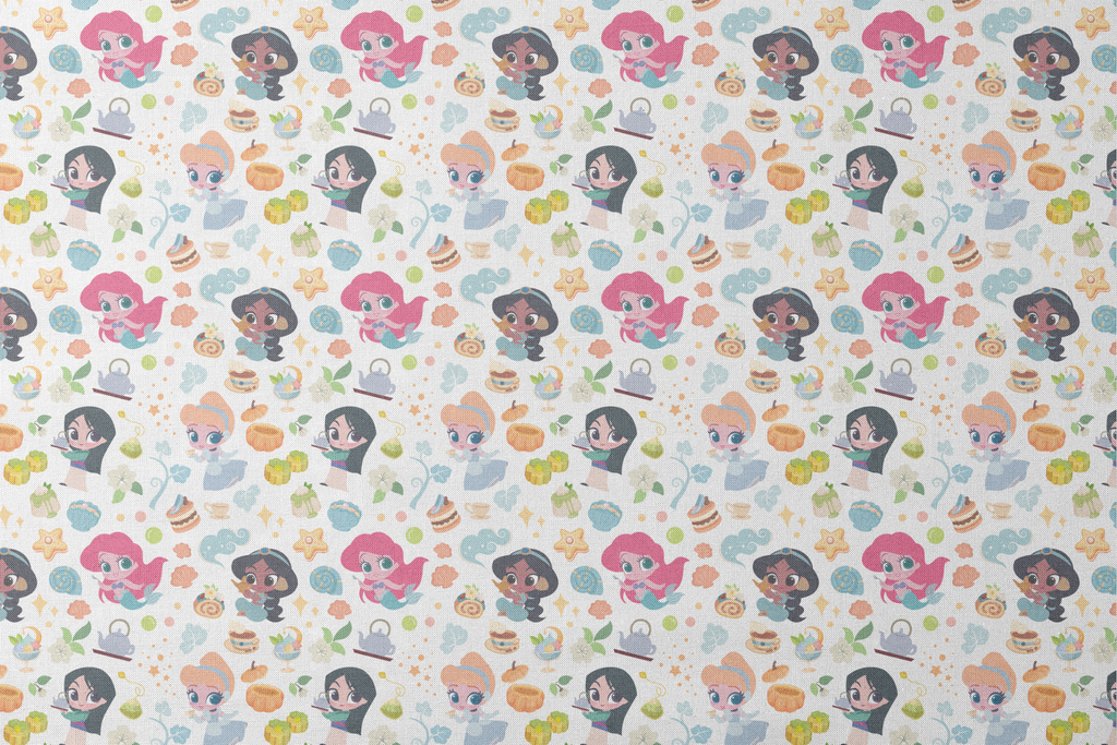 Whimsical Disney Princess pattern with Ariel, Jasmine, Cinderella, and others featuring tea sets, seashells, sweets and gifts on a light background - perfect for children's apparel and decor.