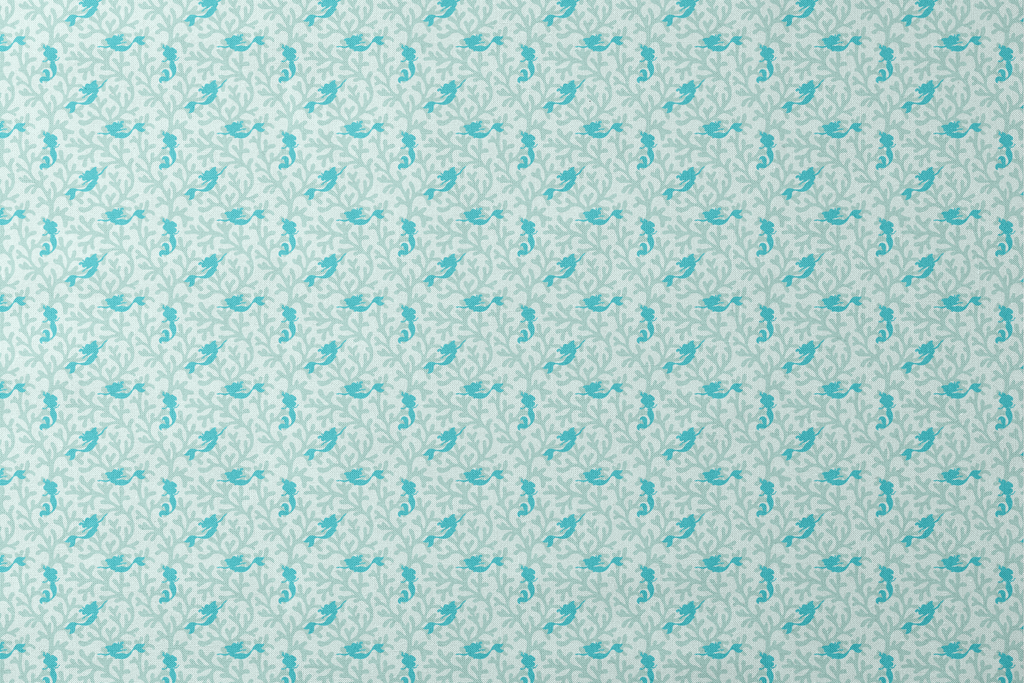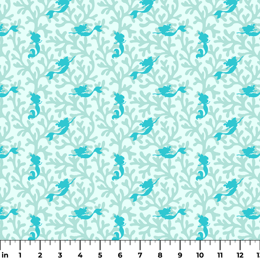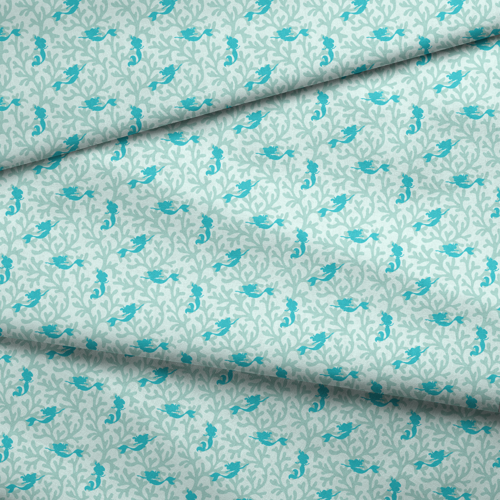 Delicate Little Mermaid-inspired pattern featuring coral and Ariel swimming among coral branches in soothing turquoise and mint hues, perfect for coastal-themed home decor or children's apparel.