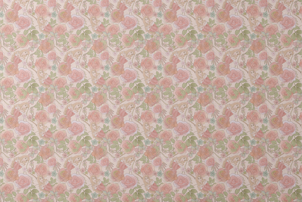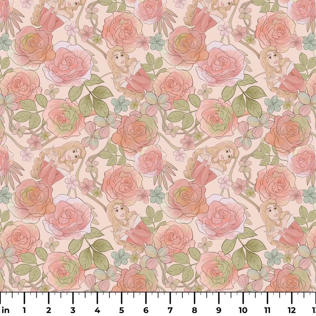Enchanting floral pattern featuring Disney Princess Aurora in delicate roses in a whimsical soft pink, peach and green hues, perfect for a dreamy vintage-inspired aesthetic.