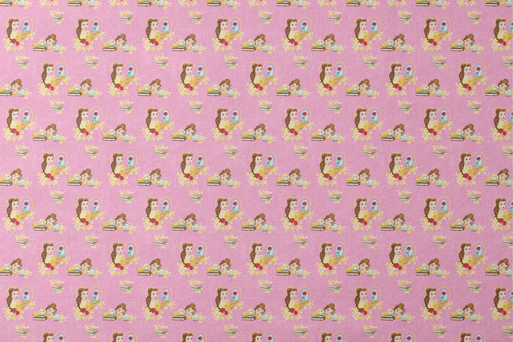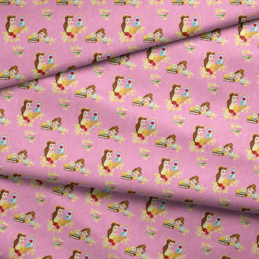 Enchanting Belle-inspired fabric on a sparkly pink background, featuring the princess with her magical rose and reading books. Perfect for little princesses and DIY dress-up projects.