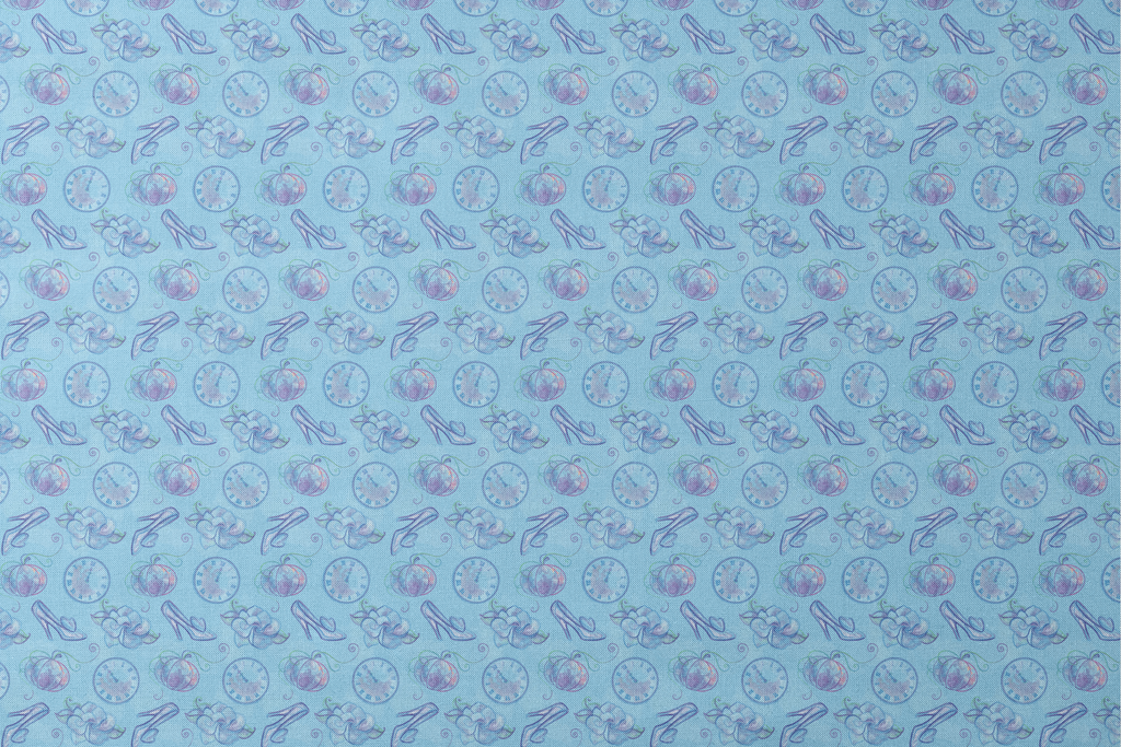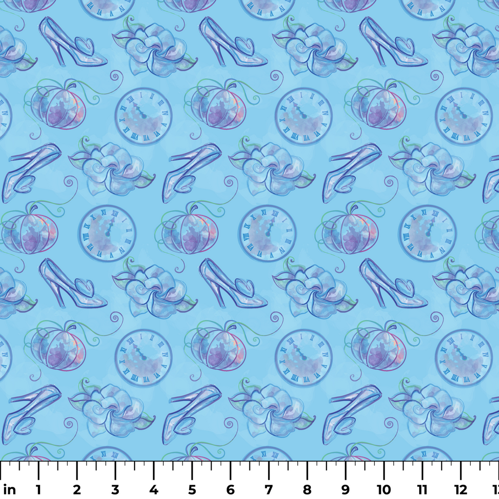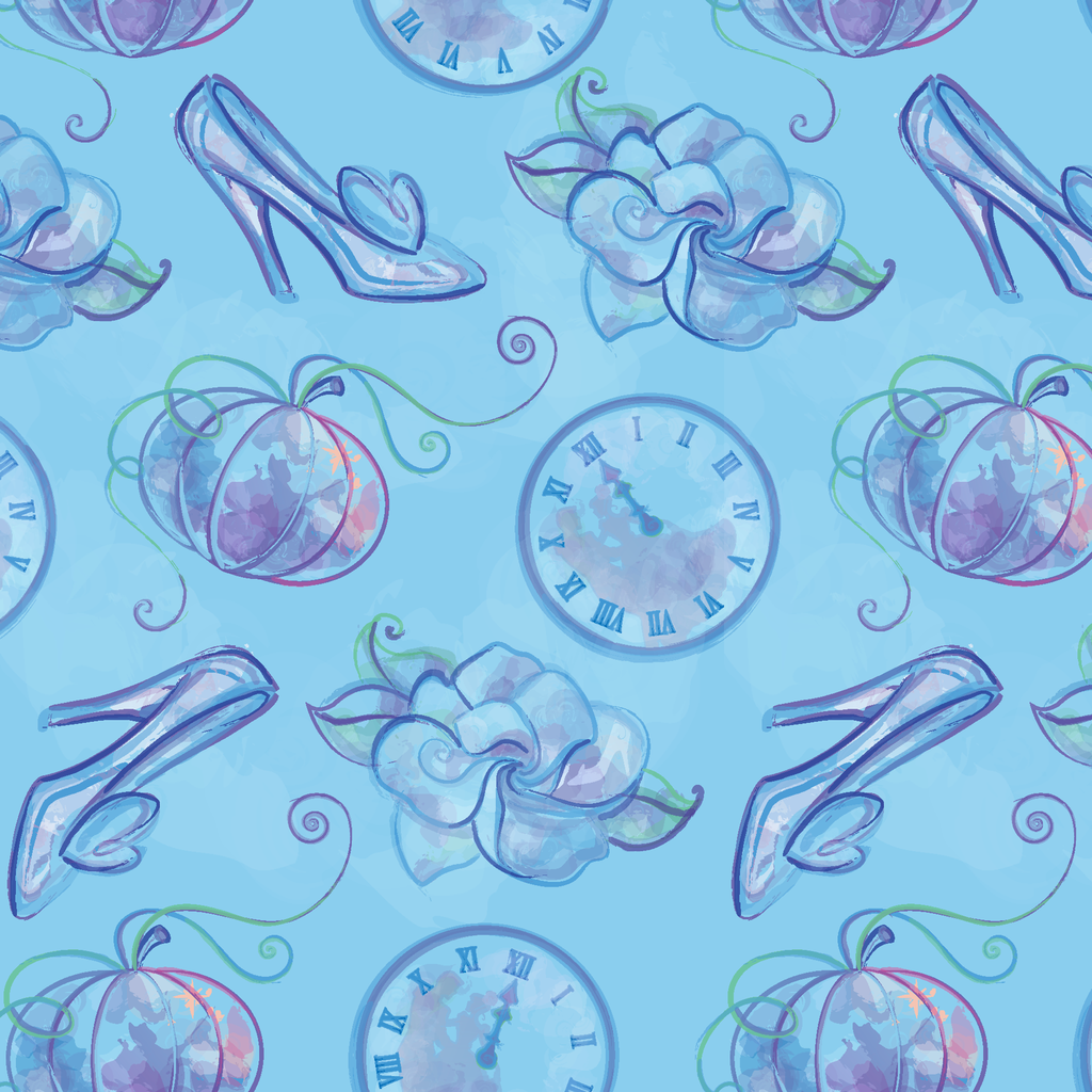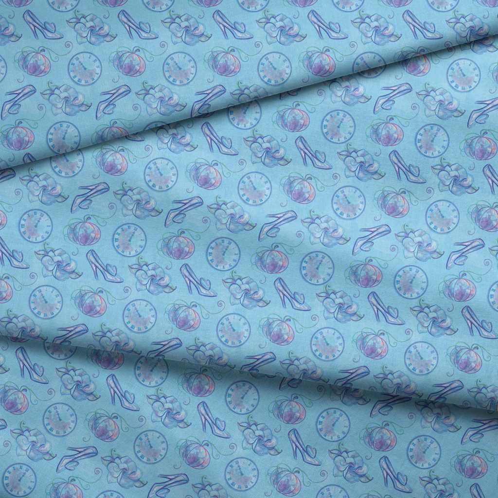Enchanting Cinderella motifs in dreamy blue hues featuring glass slippers, pumpkins, and clock faces - perfect for whimsical home decor or children's fashion.