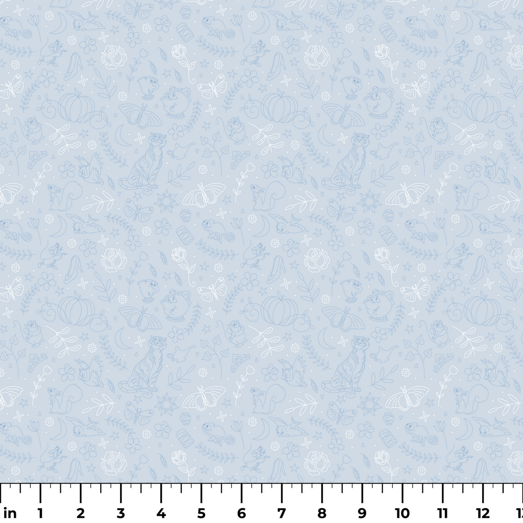 Delicate Disney Princess floral and botanical pattern featuring whimsical elements Disney Princess friends in a soft blue-gray color palette, perfect for seasonal decor.
