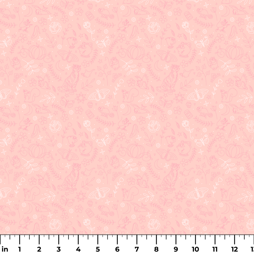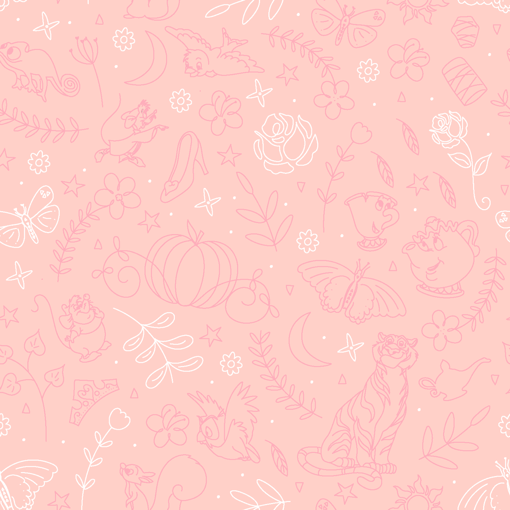 Delicate Disney Princess floral pattern in soft pink featuring whimsical doodles of Disney Princess friends - perfect for nursery decor, craft projects, or seasonal autumn designs.