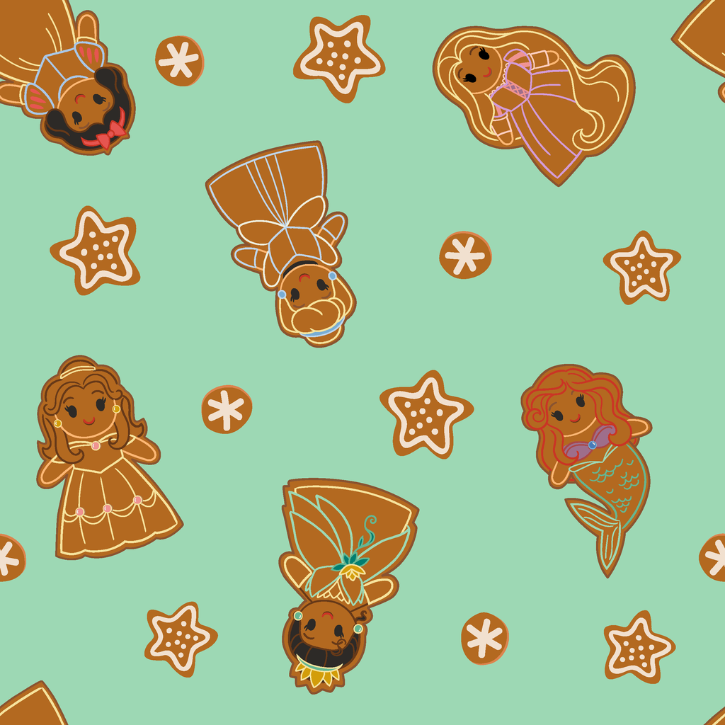 Adorable gingerbread cookie pattern featuring Disney Princesses on a mint green background with decorative stars and snowflakes for holiday baking and seasonal celebrations.