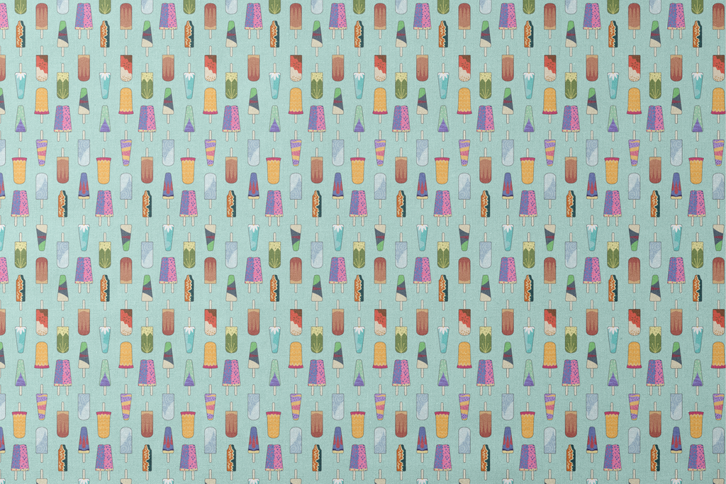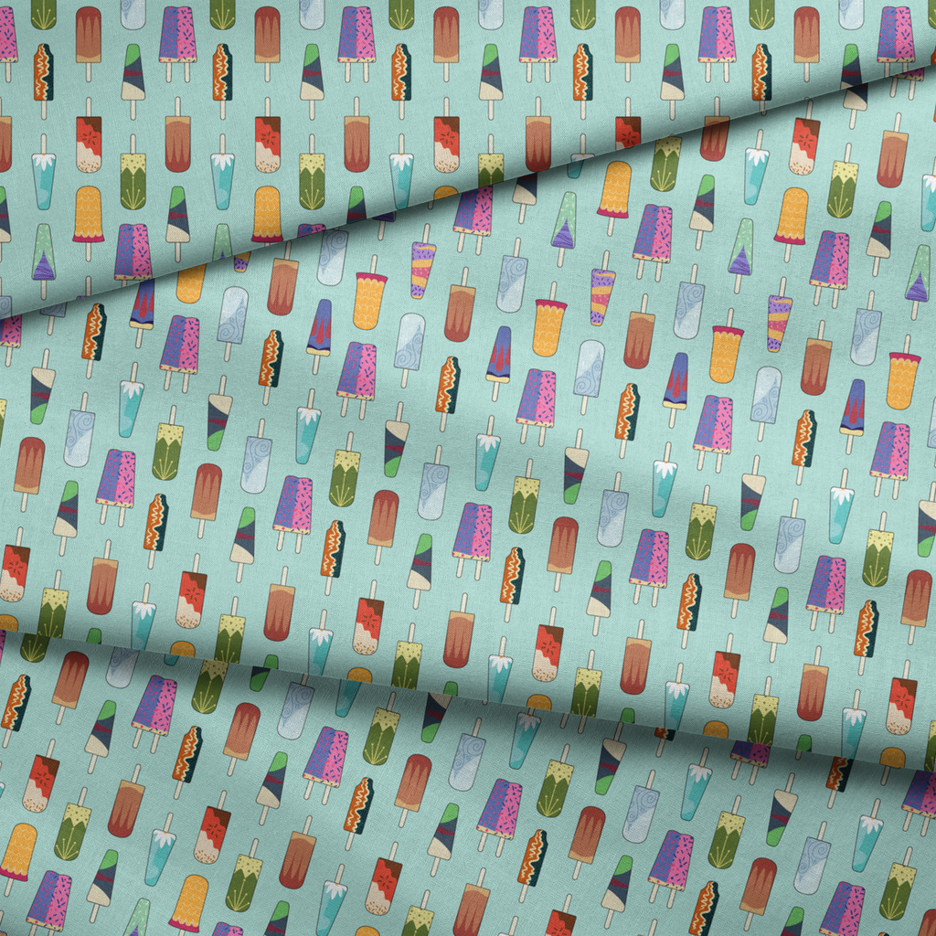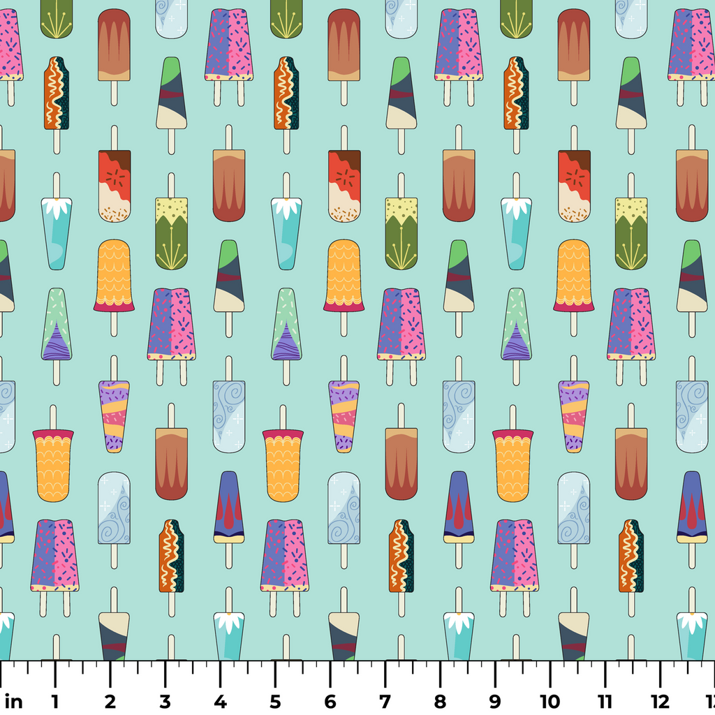 Colorful Disney Princess-inspired popsicle pattern with vibrant fruit and ice cream treats on a light blue background - perfect for summer fun or kitchen decor with a retro ice cream parlor vibe.
