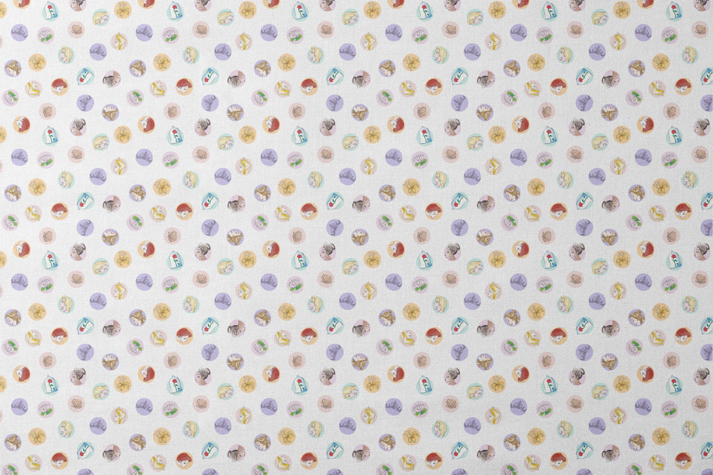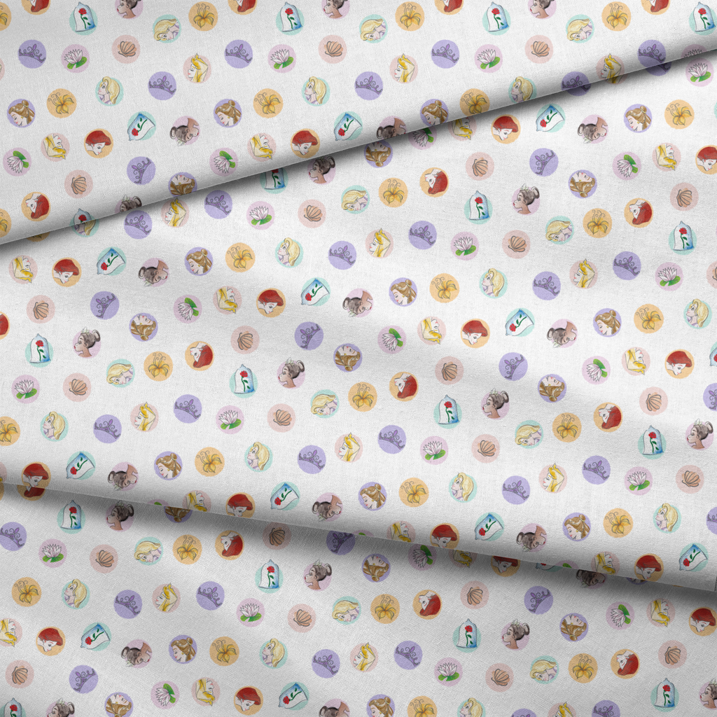 Enchanting Disney Princess-inspired pattern featuring magical roses, animated characters, and charming motifs in pastel circles. Perfect for whimsical home decor or children's apparel.