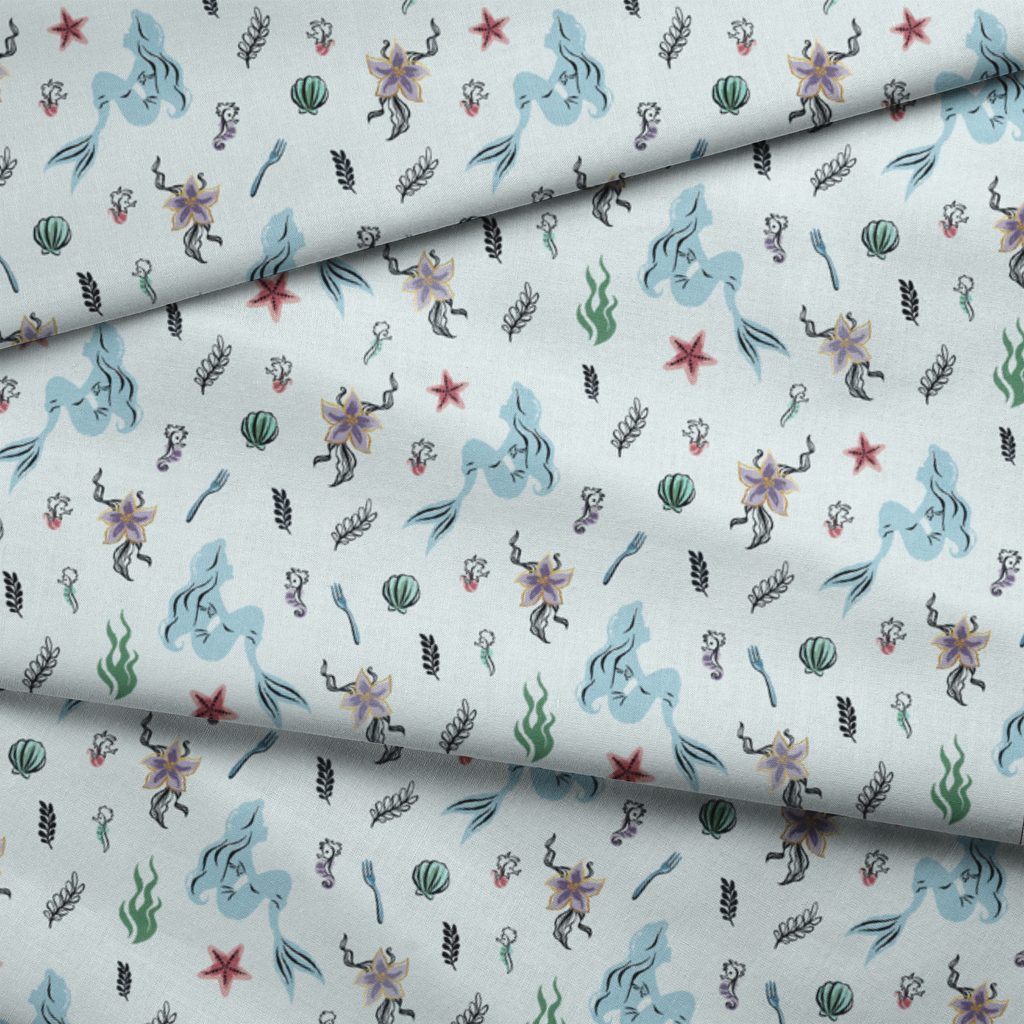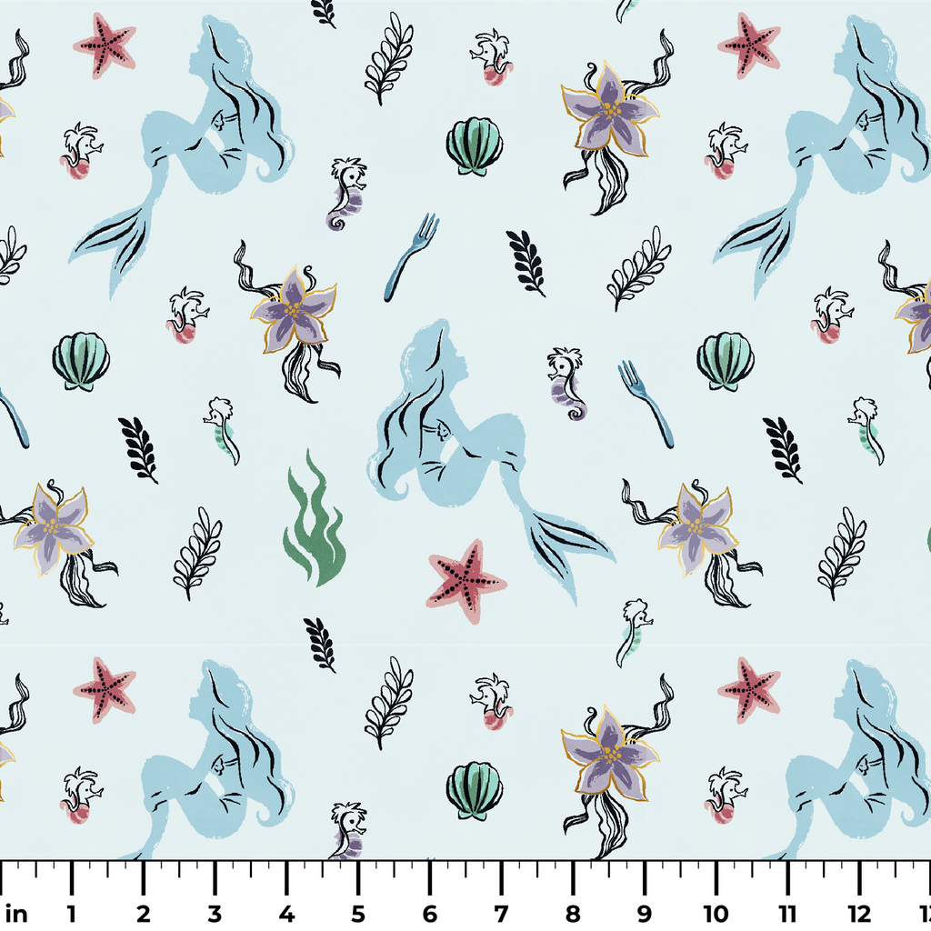 Dive into an enchanting underwater world with this dreamy Disney The Little Mermaid fabric featuring soft blue silhouettes of Ariel against a crisp light blue background. Delicate seahorses in lavender and mint hues frolic alongside mint seashells and elegant purple flowers with flowing black tendrils. The whimsical hand-drawn style gives this fabric a charming quality perfect for children's bedroom decor, summer tote bags, or coastal-themed quilting projects.