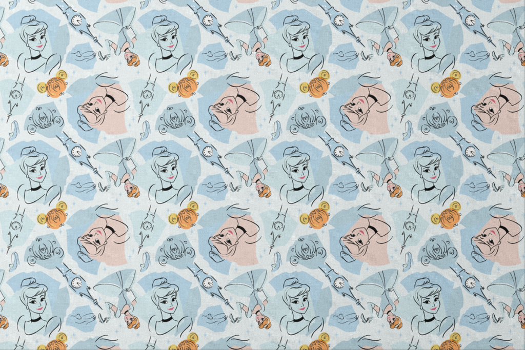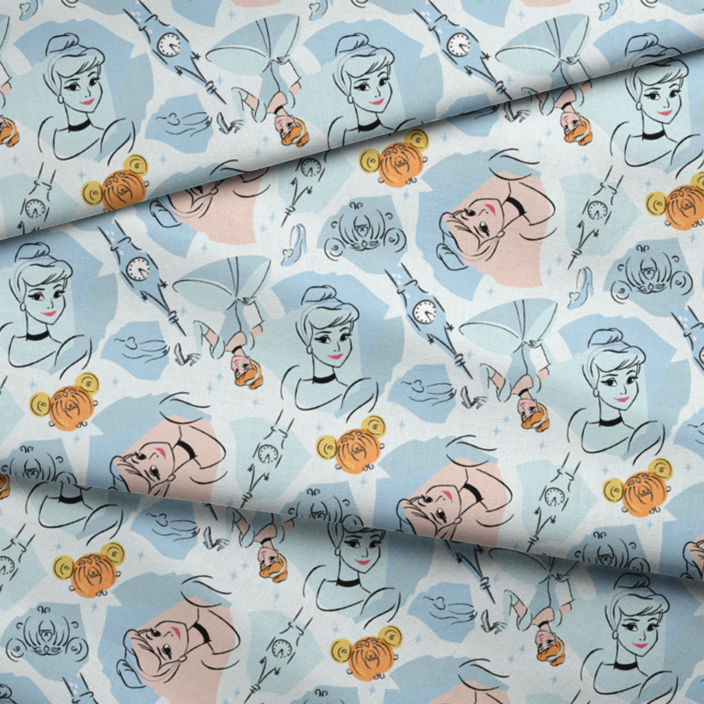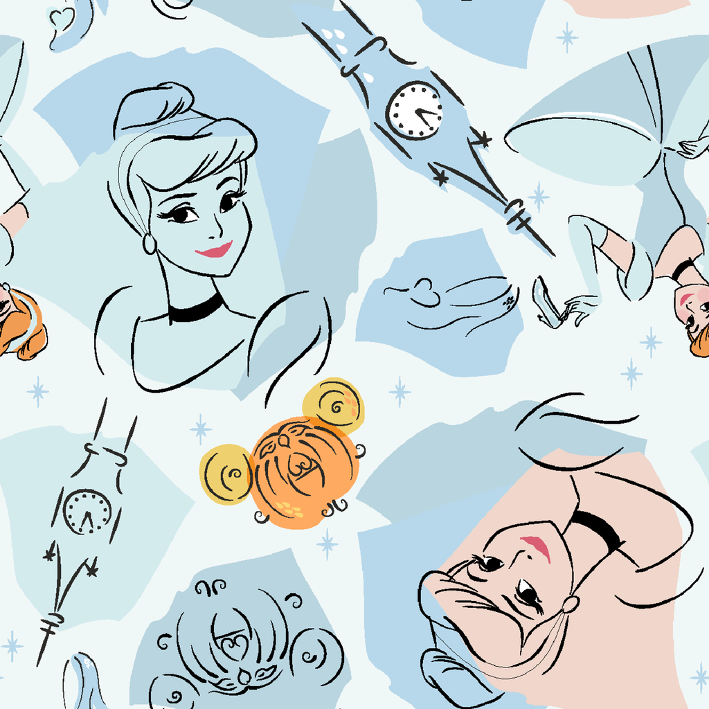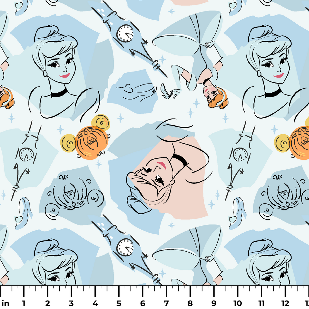 This enchanting fabric features a dreamy Cinderella-inspired design with elegant line drawings scattered on a soft blue and white background. Clock towers, pumpkin carriages, and sparkling stars add charming touches throughout the whimsical pattern. Perfect for creating fairy tale-inspired nursery items, special occasion dresses, or themed pillowcases that bring storybook charm to any space.