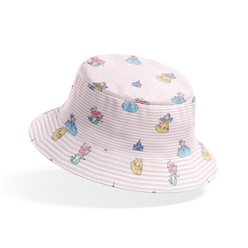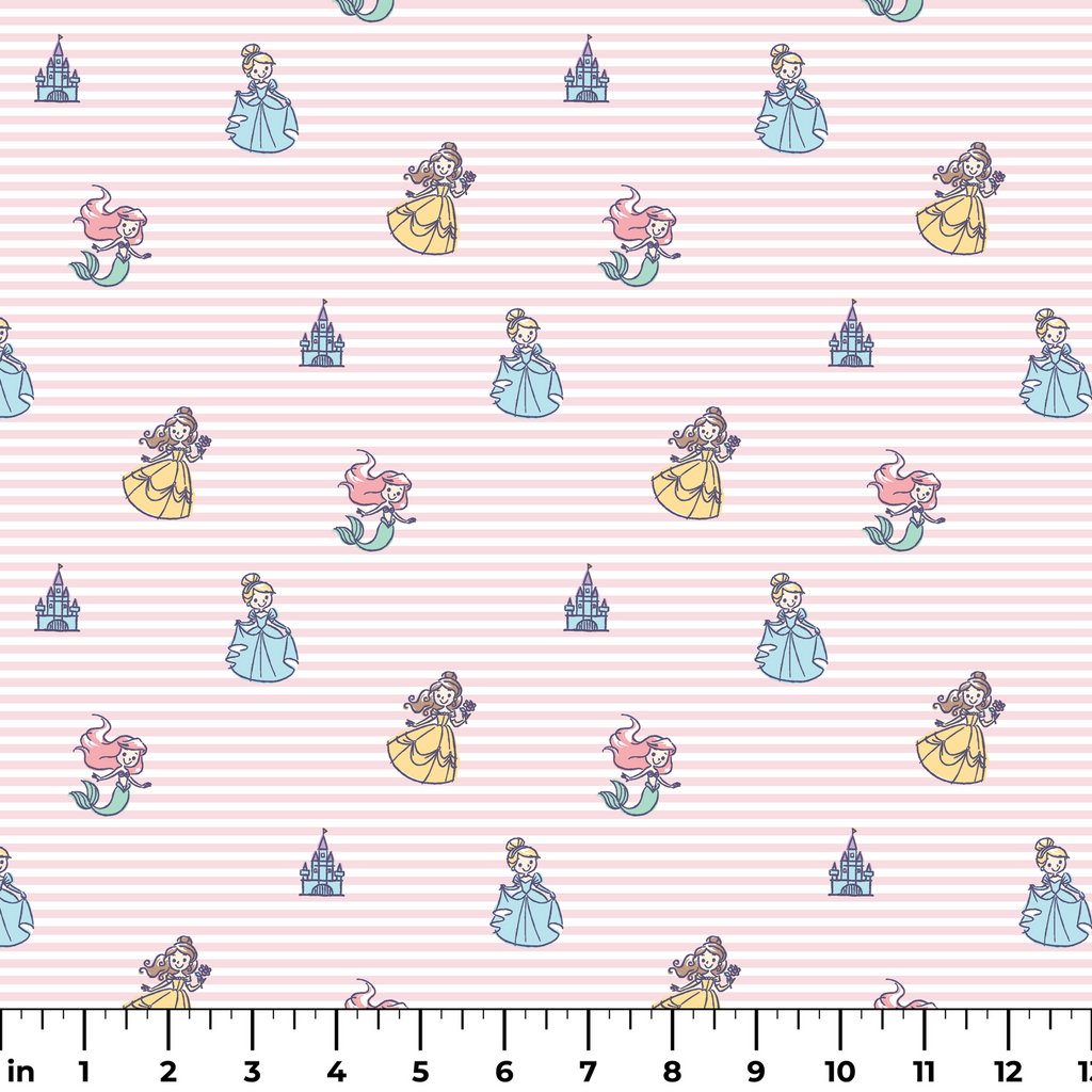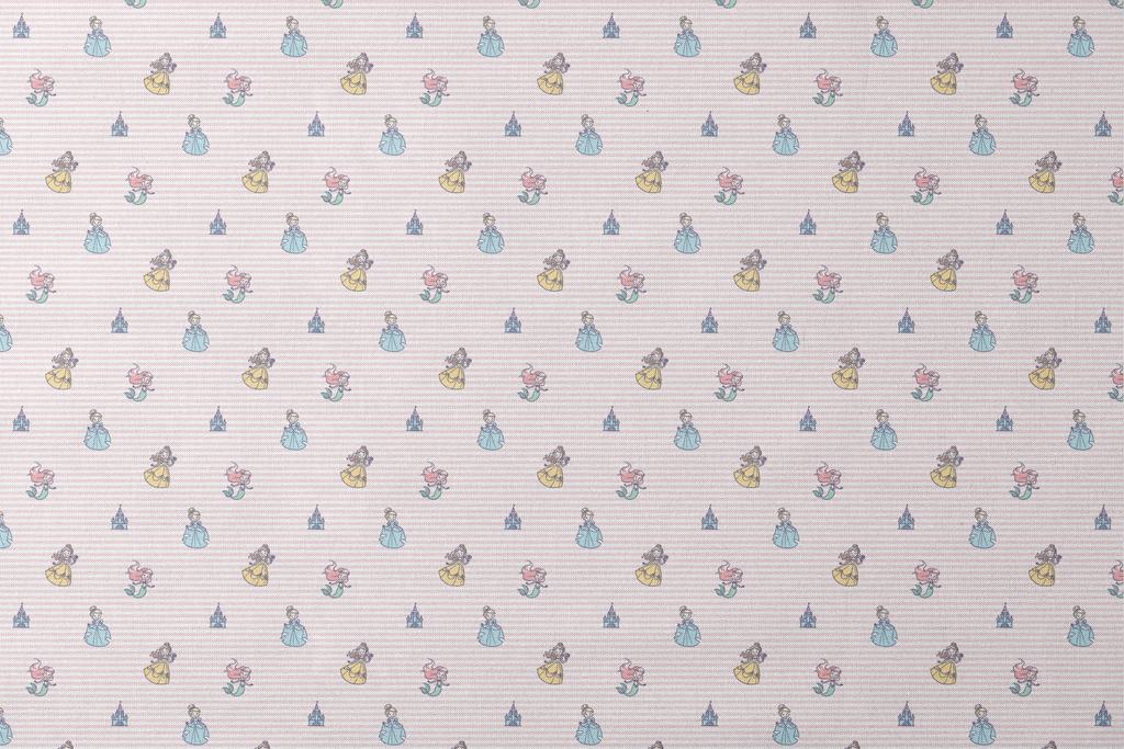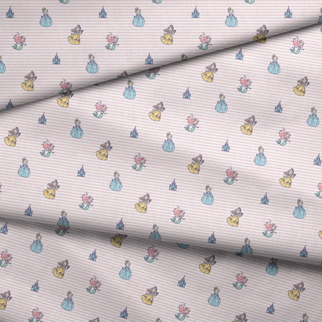 Disney Princess pattern featuring characters, all set against a soft pink striped background with castle motifs.