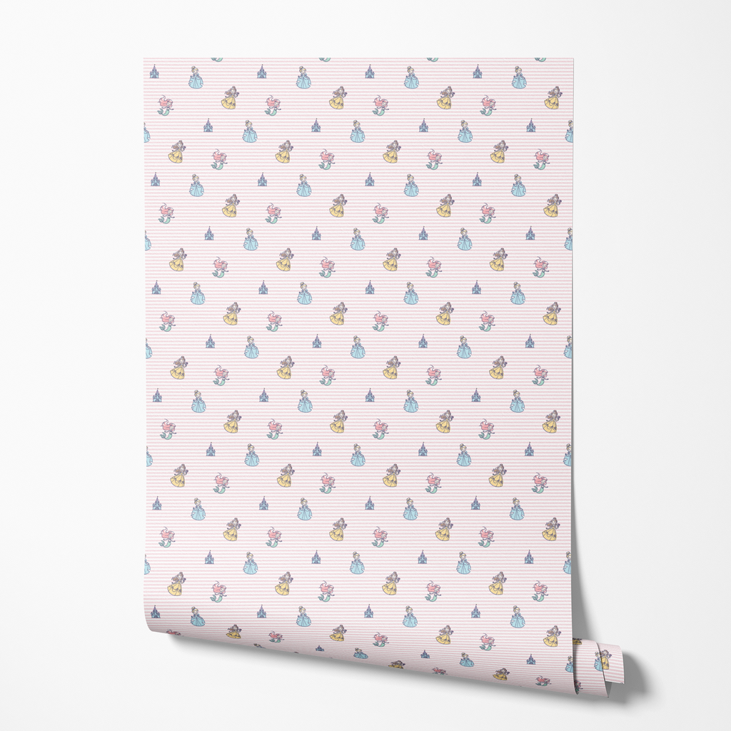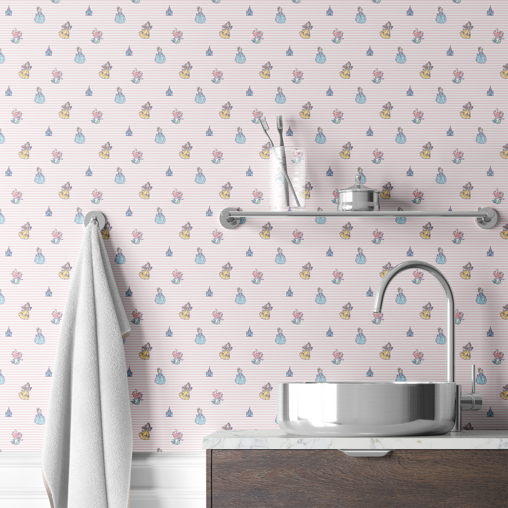 Disney Princess pattern featuring characters, all set against a soft pink striped background with castle motifs.