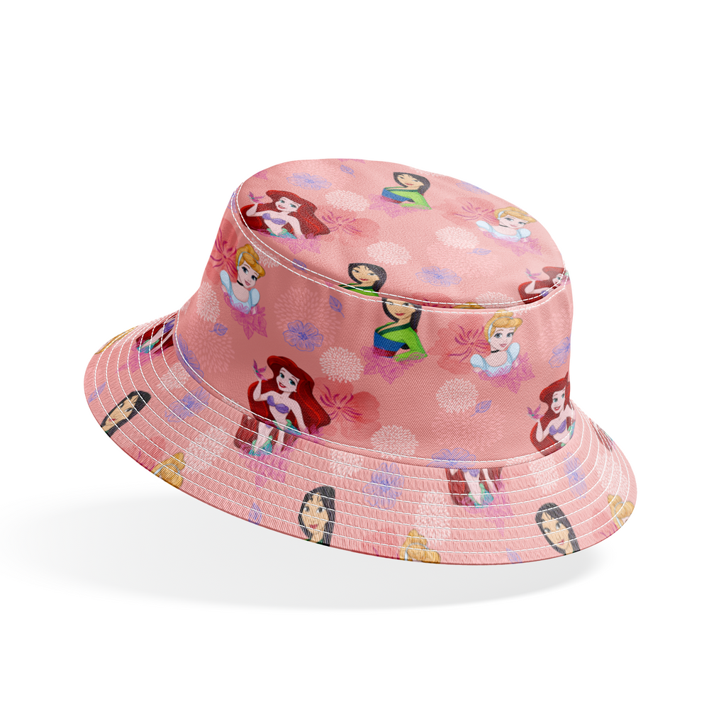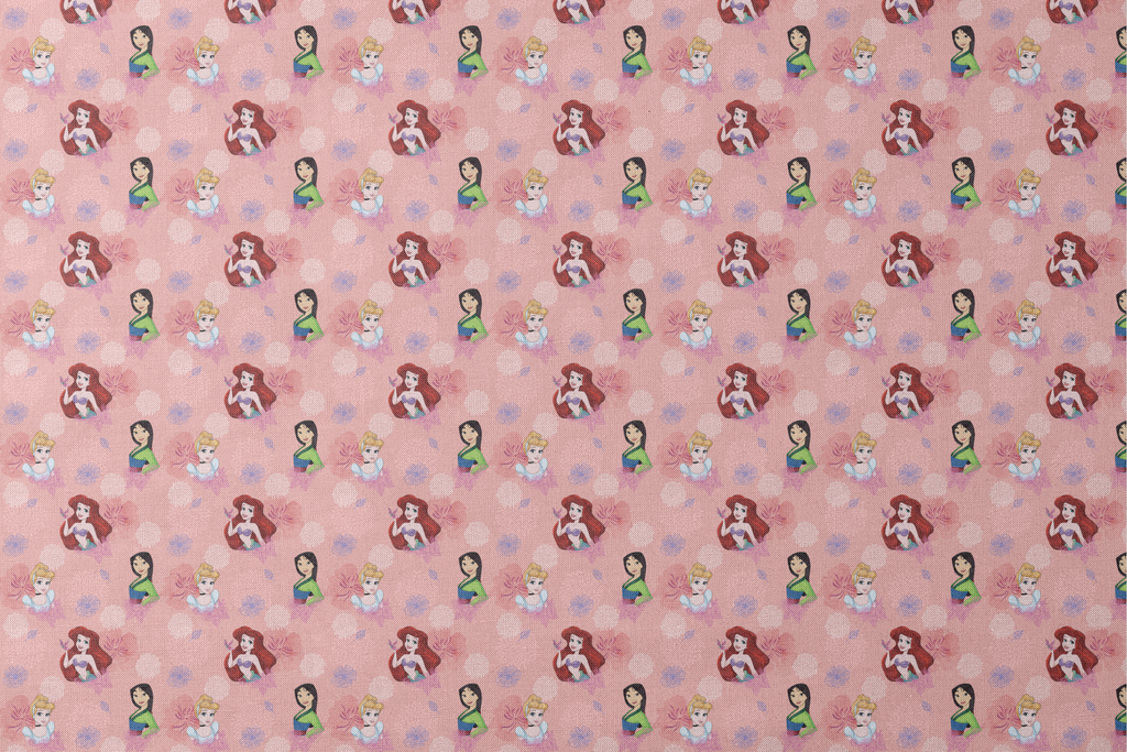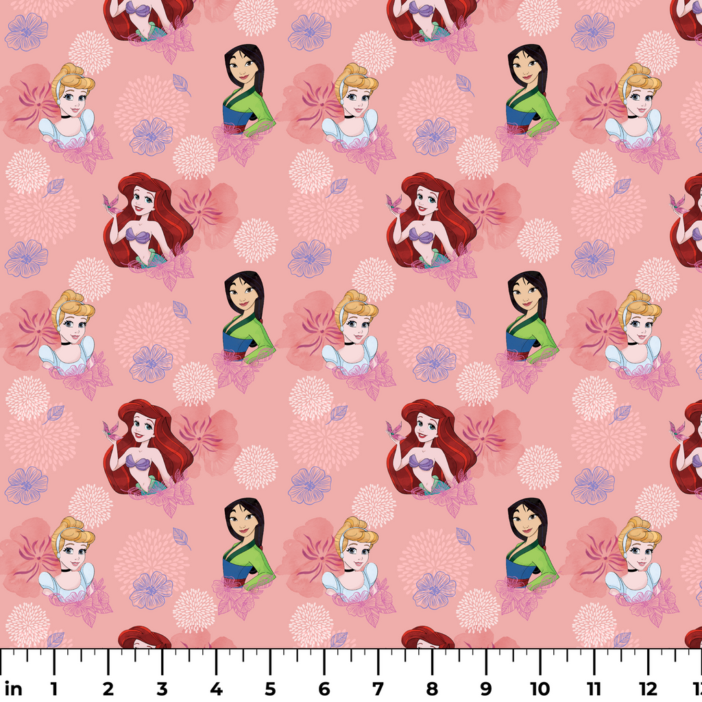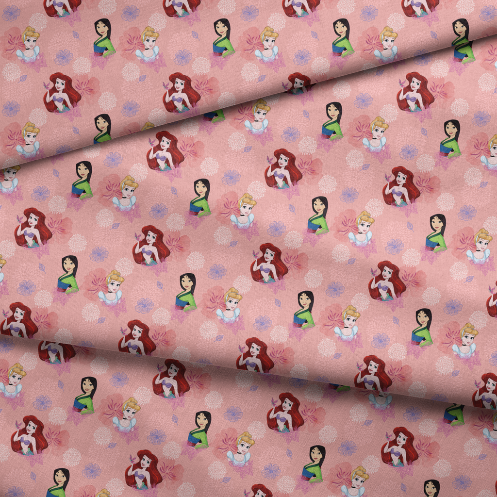 This enchanting Disney Princesses pattern features Cinderella, Mulan, and Ariel on a pink floral background, perfect for kids' apparel or room decor in a whimsical, feminine style.