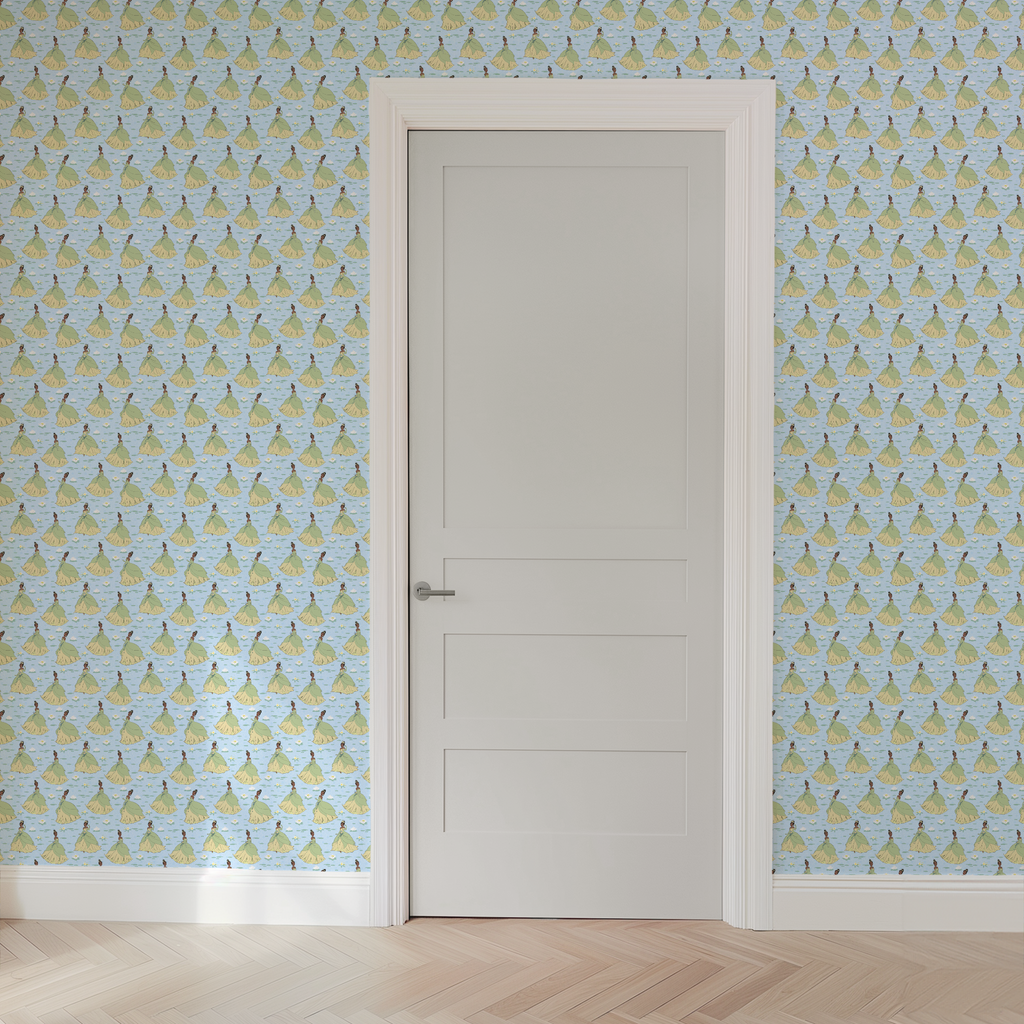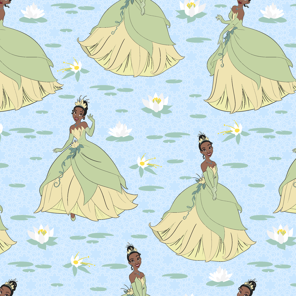 This charming Disney Tiana inspired pattern features elegant dresses in soft green and yellow tones with delicate white water lilies floating on a blue water background.