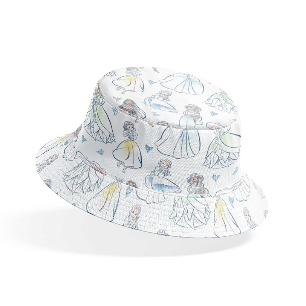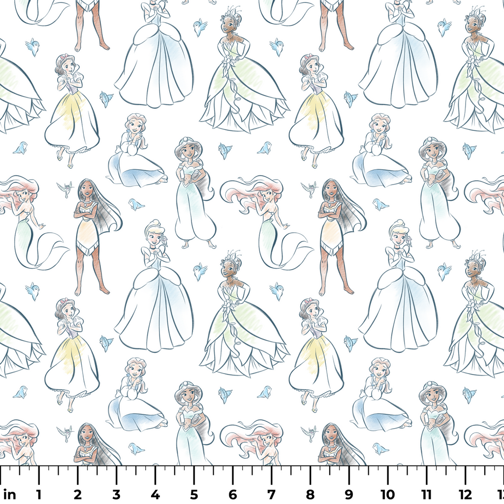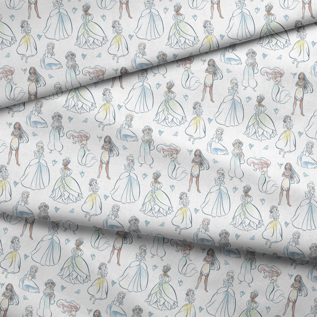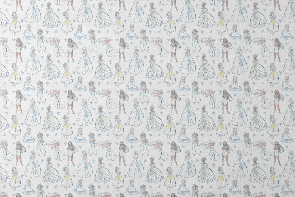 Delicate sketch-style Disney Princess pattern featuring elegant ball gowns, crowns, and sparkling diamonds in a soft blue and white color palette. Perfect for enchanting children's room decor or fantasy-themed crafting projects.