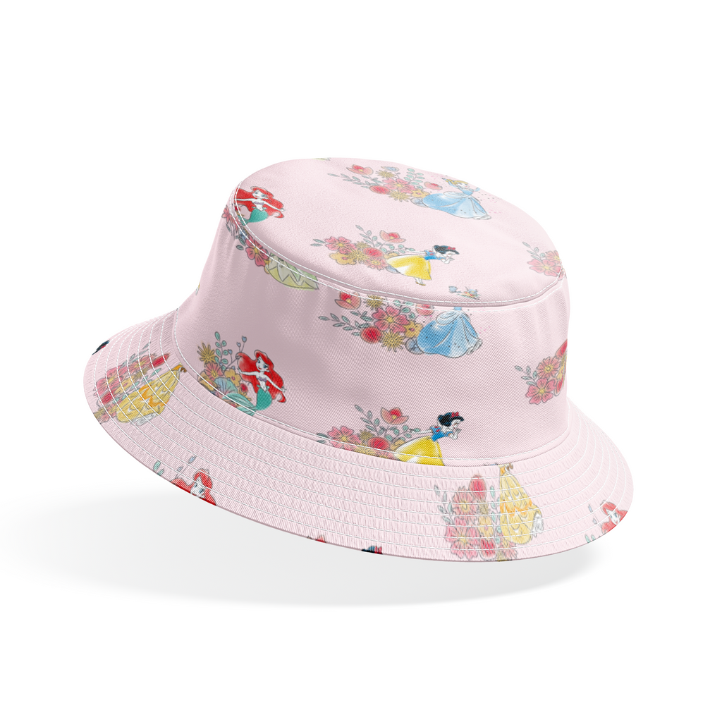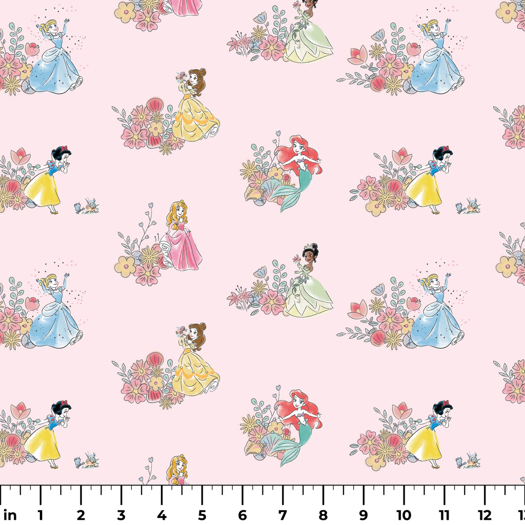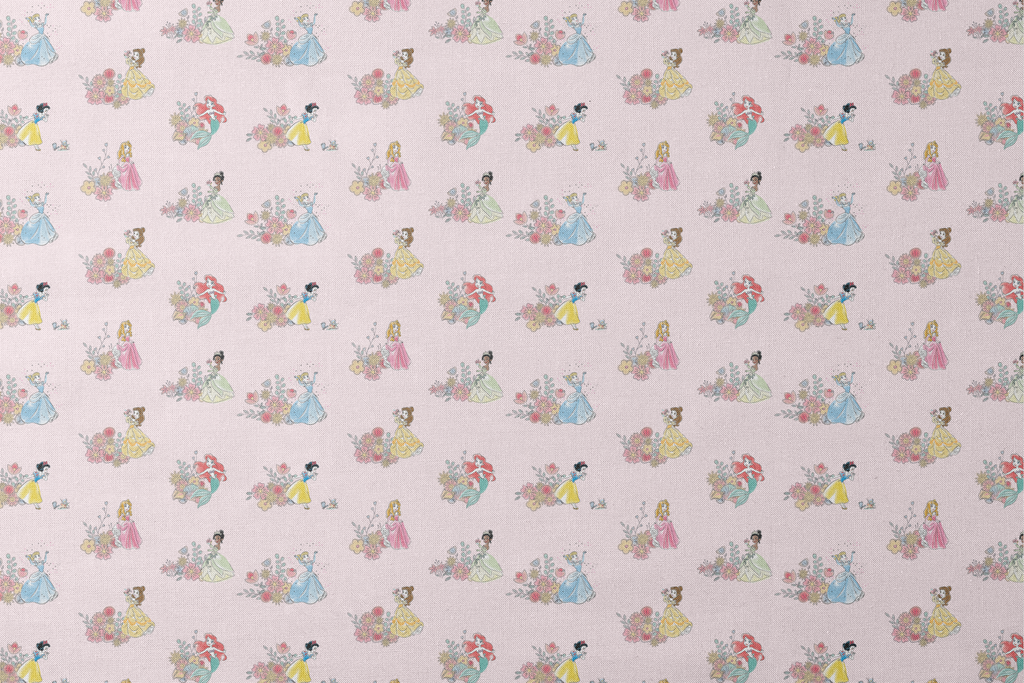 This enchanting Disney Princess pattern features beloved characters surrounded by beautiful floral arrangements on a soft pink background, perfect for magical nursery decor or girls' room projects.