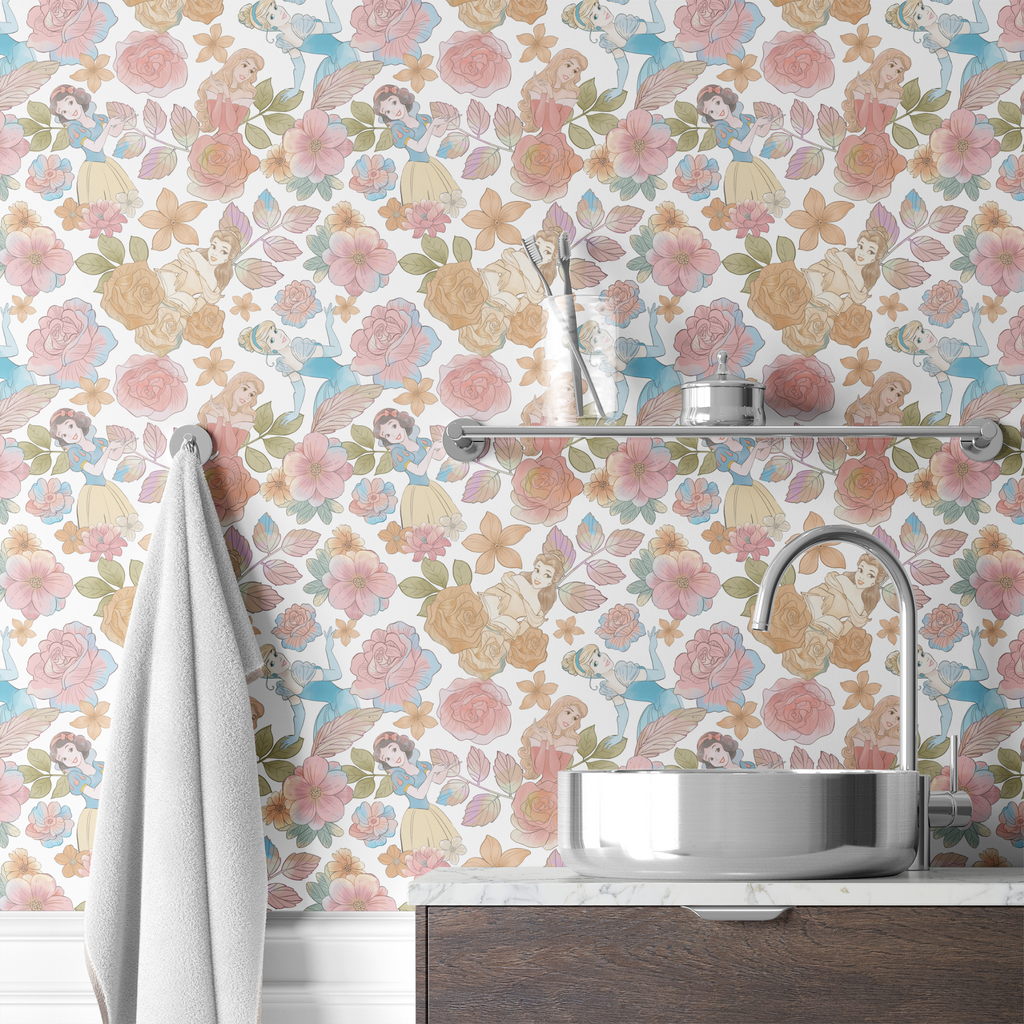 This Disney Princess characters pattern in floral features Cinderella, Snow White, Aurora and Belle around delicate roses, blossoms and greenery in soft pastel colors. Perfect for nurseries.