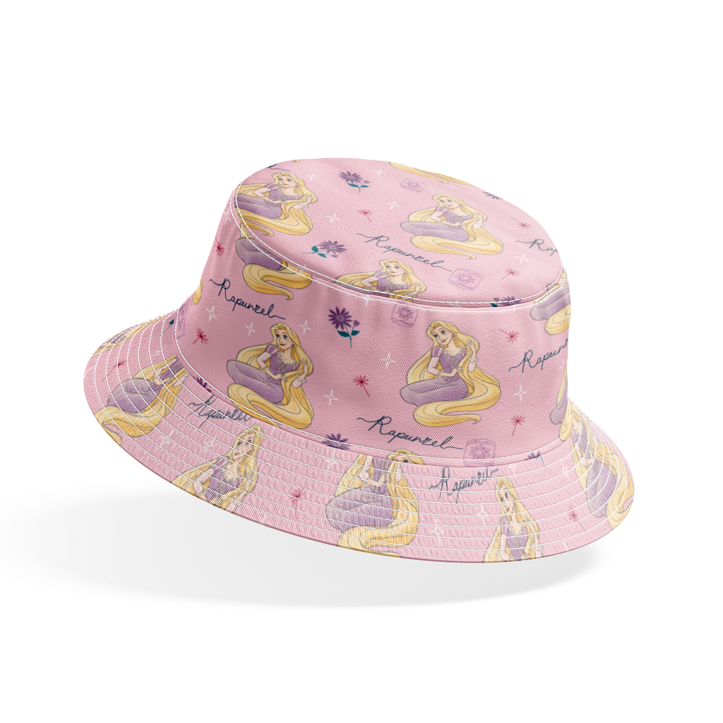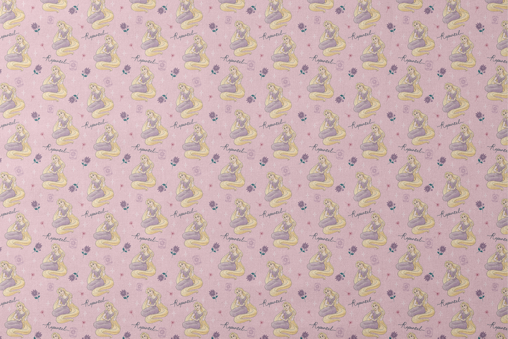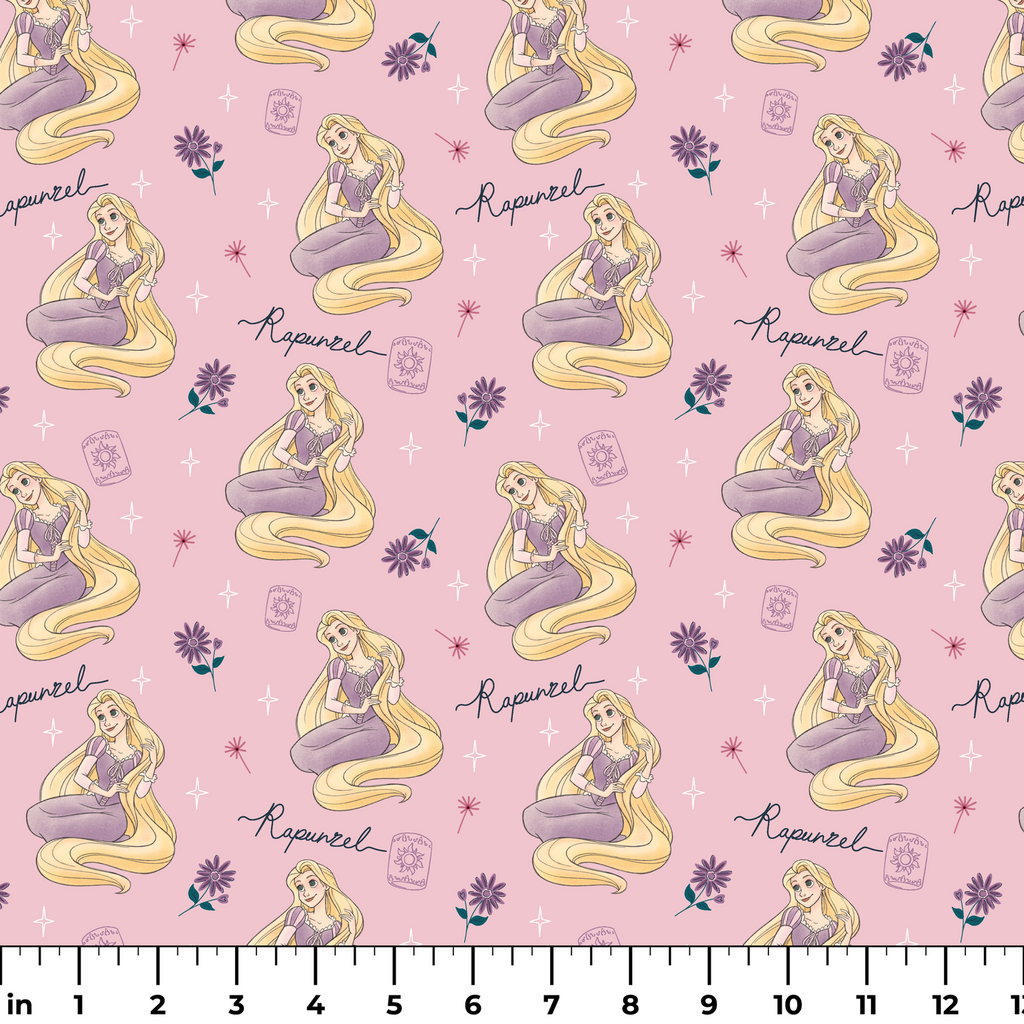 Enchanting Rapunzel pattern featuring the Disney princess with her long blonde hair in a lavender dress, surrounded by flowers and stars on a soft pink background.