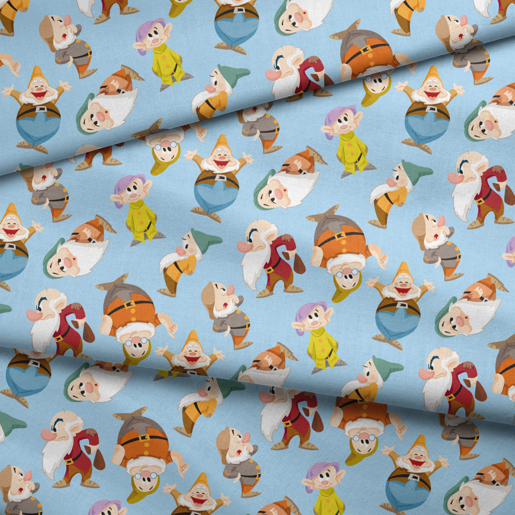 Classic Seven Dwarfs pattern featuring colorful characters on a sky blue background. Perfect for Disney fans and children's decor with its whimsical, cheerful design.
