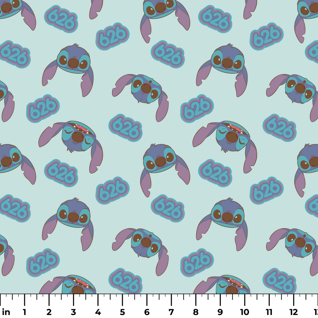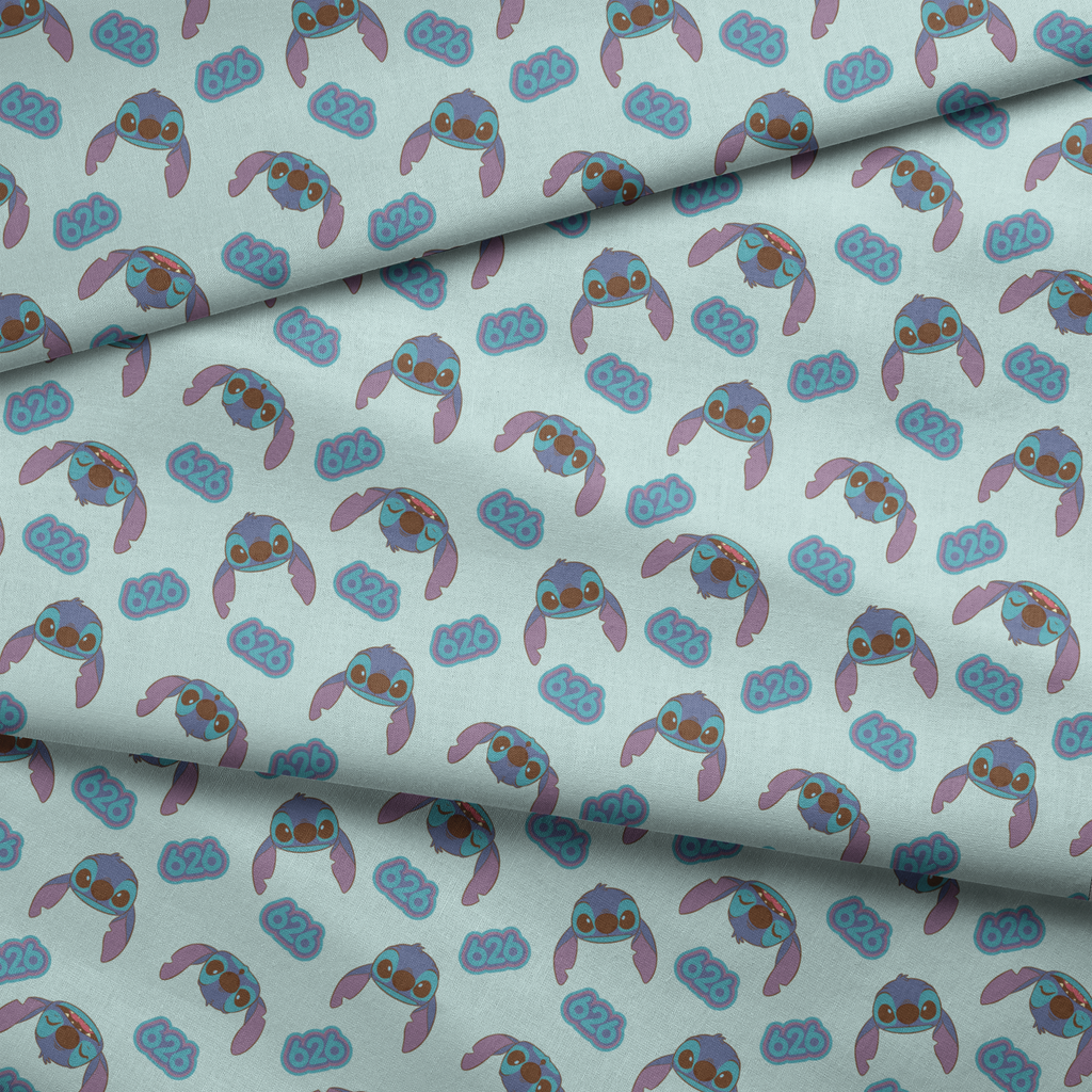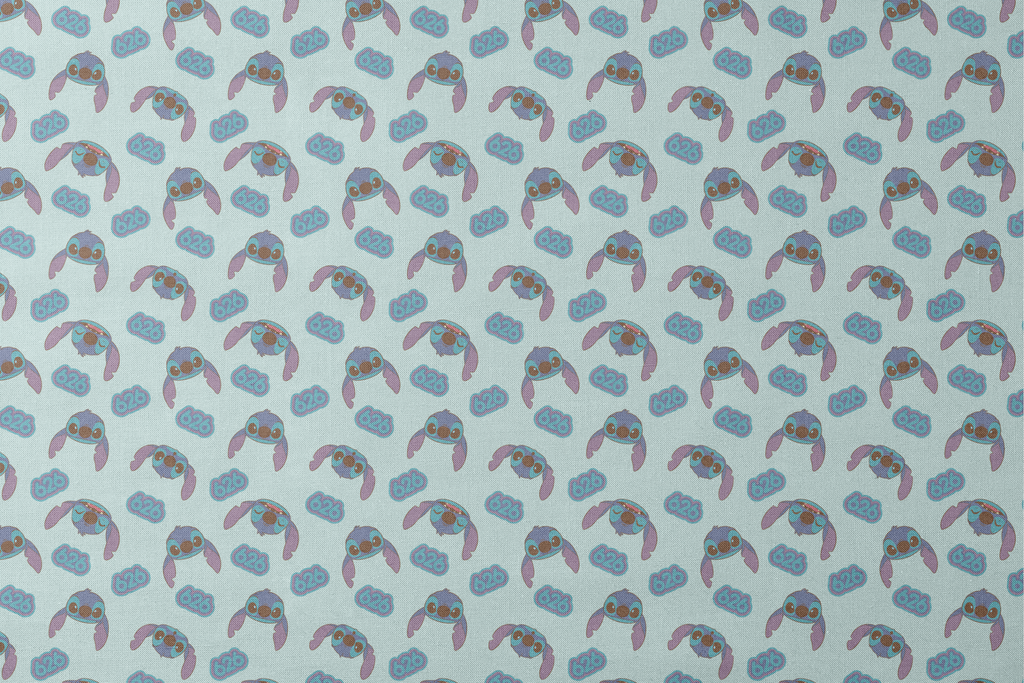Adorable Disney Disney Lilo & Stitch character pattern featuring cartoon faces and decorative swirls on a light teal background. Perfect for fans of cute sci-fi themed merchandise and animated films.