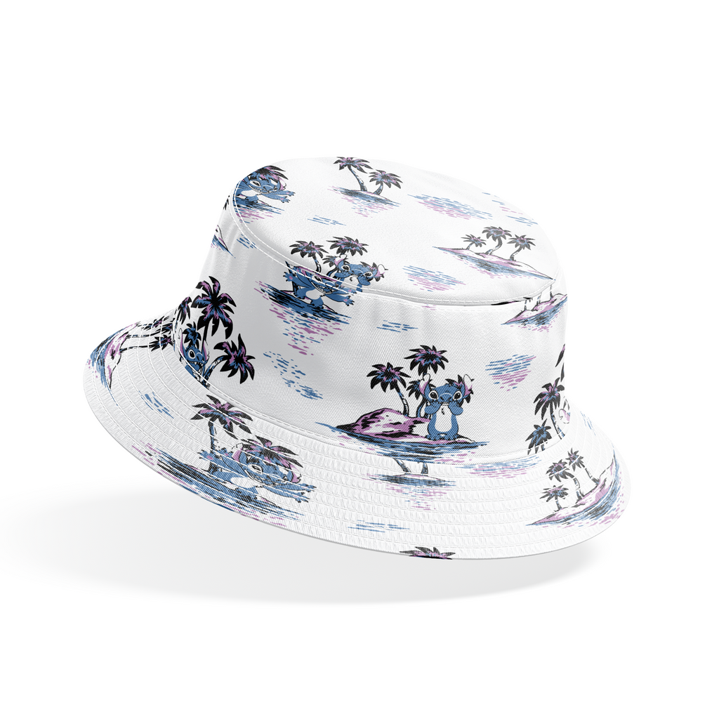 Disney Stitch featuring various poses on a tropical island with palm trees and ocean waves in blue and purple tones. Perfect for beach decor or crafting projects.