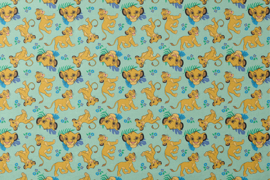 Adorable Disney The Lion King pattern with playful Simba in different poses on a mint green background featuring purple and blue flowers, perfect for Disney fans and nursery decor.
