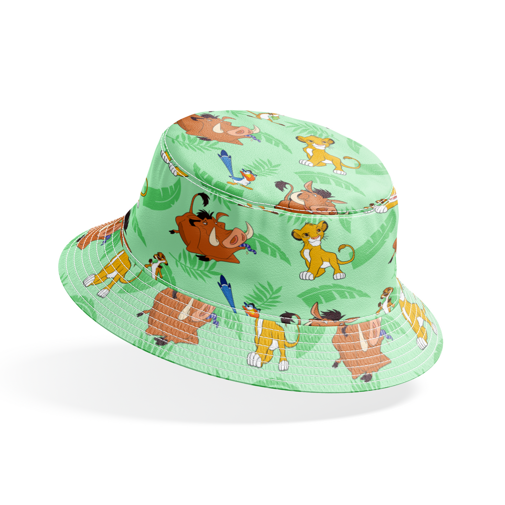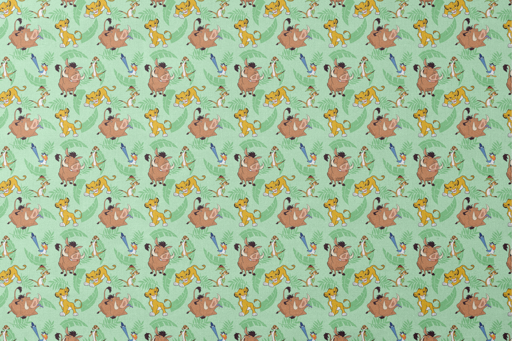 Classic Disney The Lion King pattern featuring Simba, Timon, Pumbaa, and Zazu on a mint green background with tropical leaves. Perfect for Disney fans and children's decor.