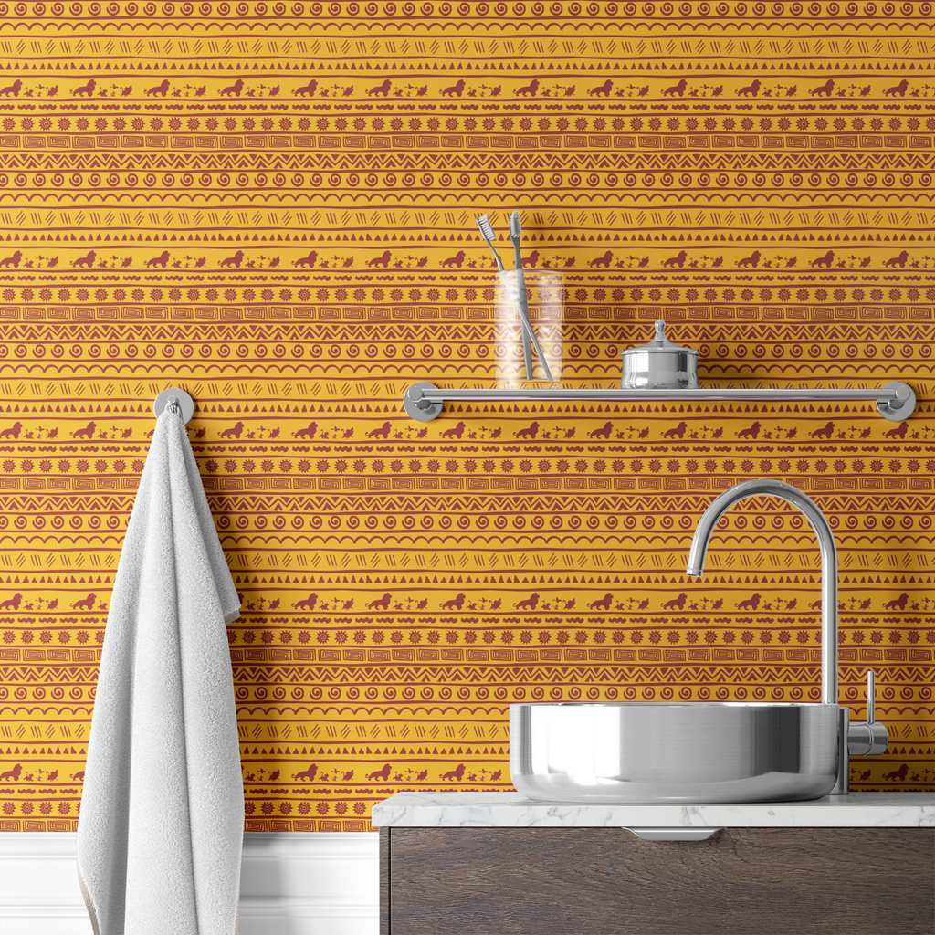 This traditional Disney-inspired pattern features The Lion King motifs on a golden backdrop, including characters, suns, spirals, and geometric shapes for a rich, cultural aesthetic.