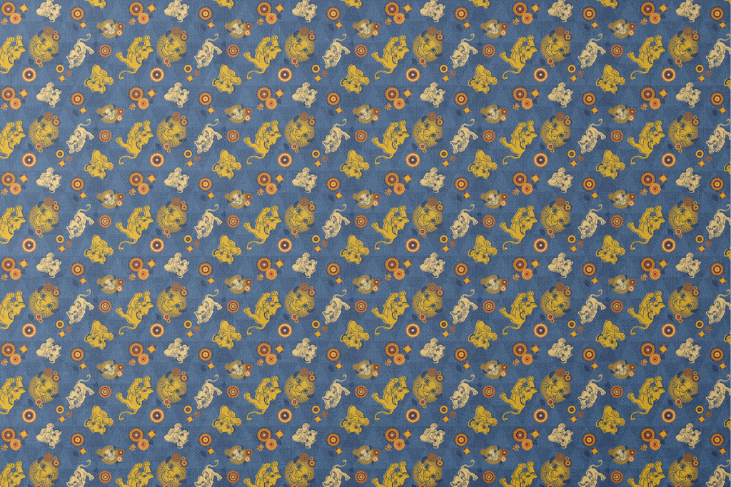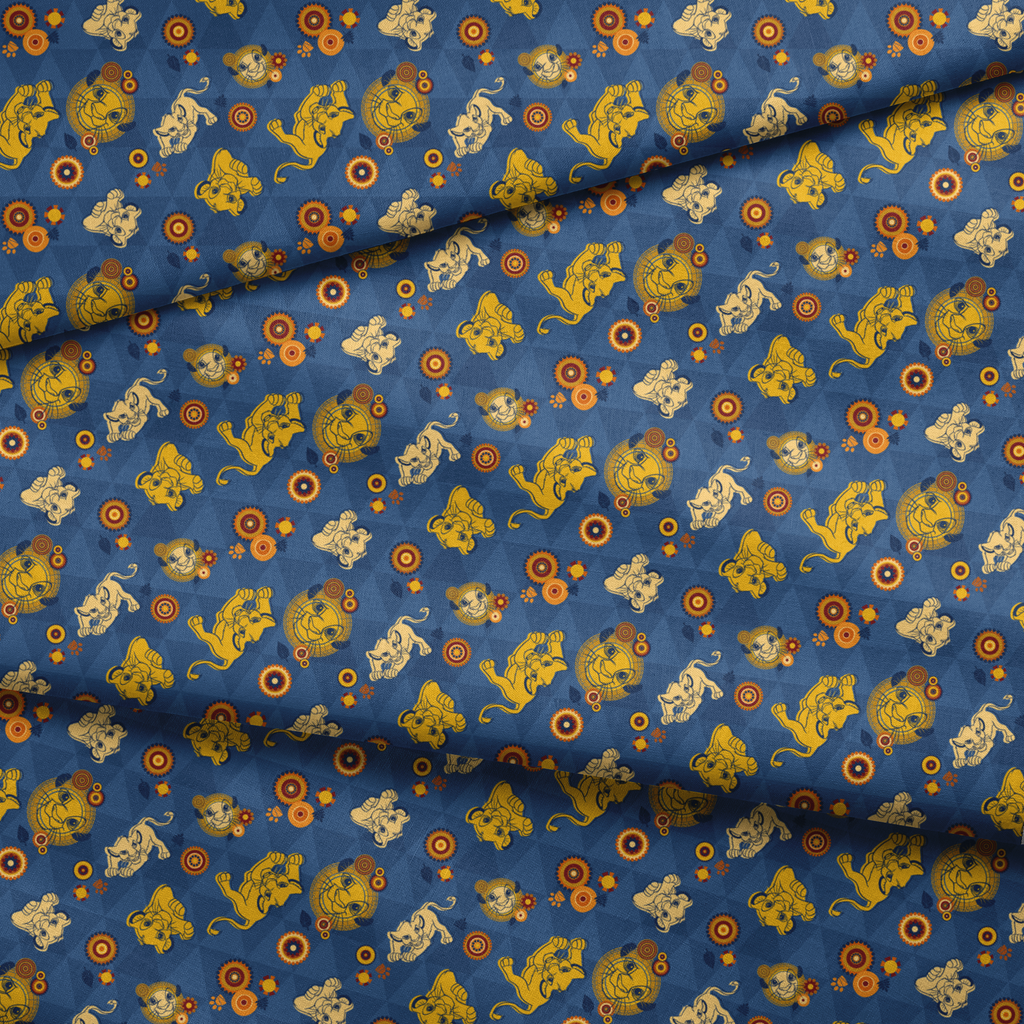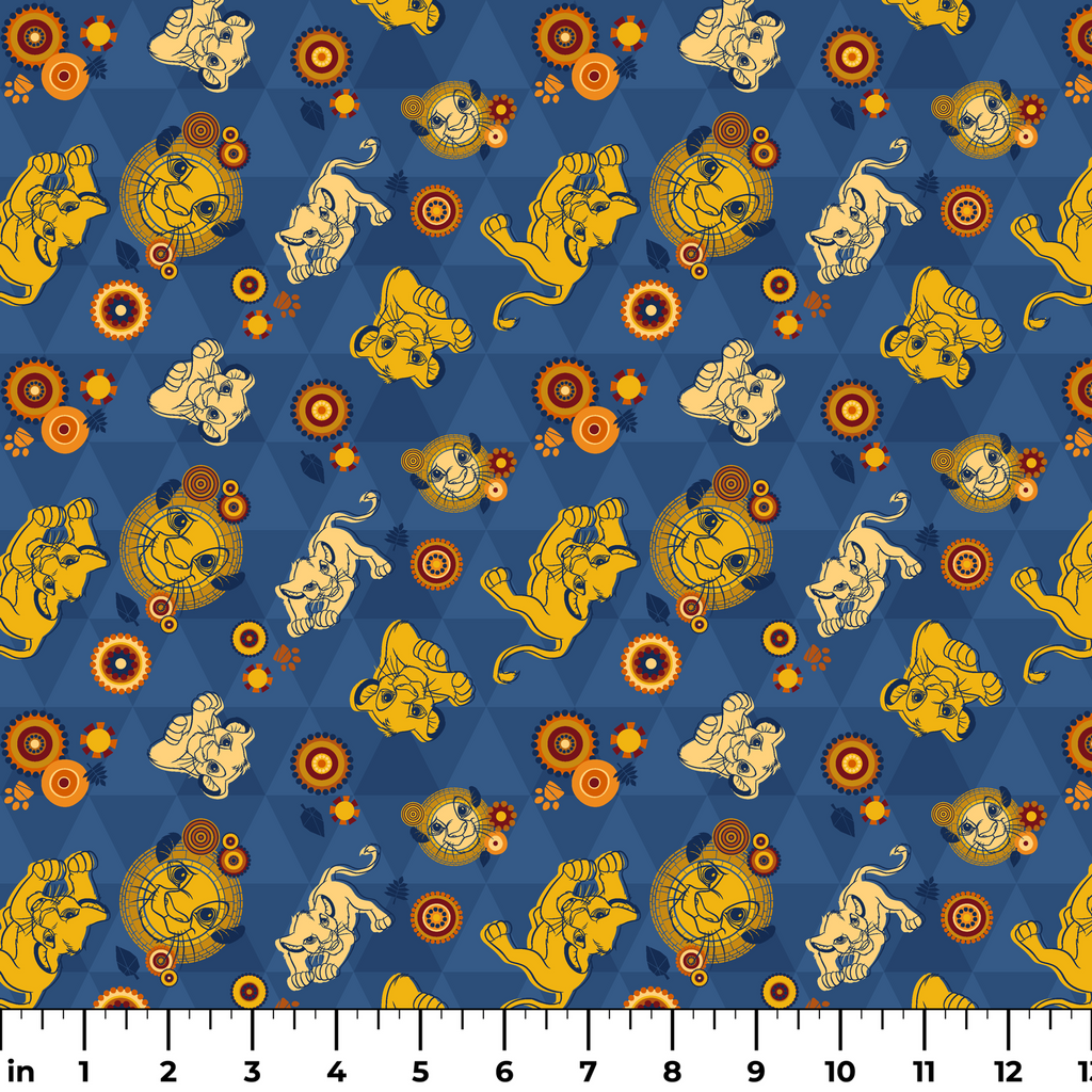 Disney The Lion King characters paired with intricate circular patterns on a blue geometric background. This playful movie-inspired design blends retro style with African cultural influences.