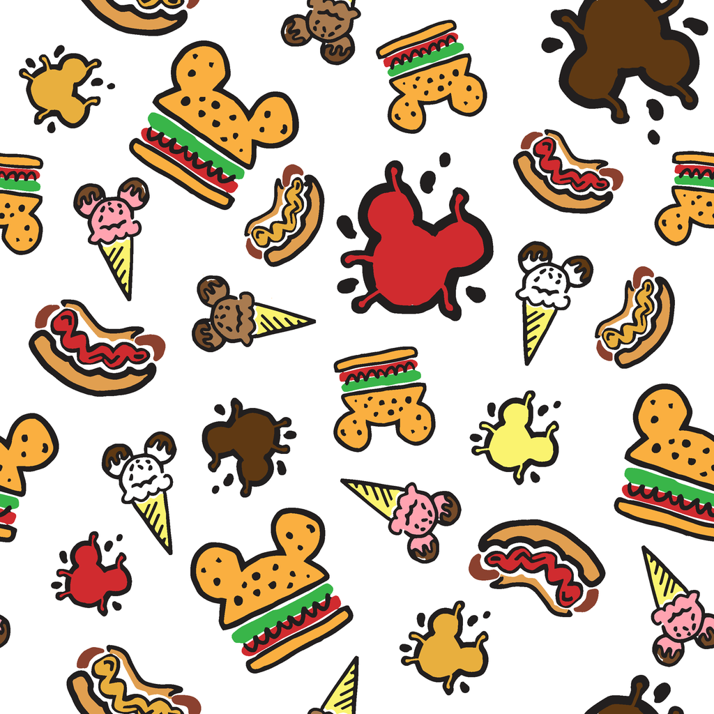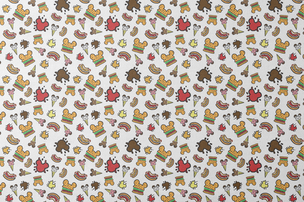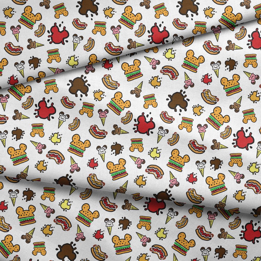 Playful Disney-inspired food pattern featuring Mickey Mouse-shaped burgers, hot dogs, ice cream cones, and apples in vibrant colors on a white background - perfect for kitchen decor or casual accessories.