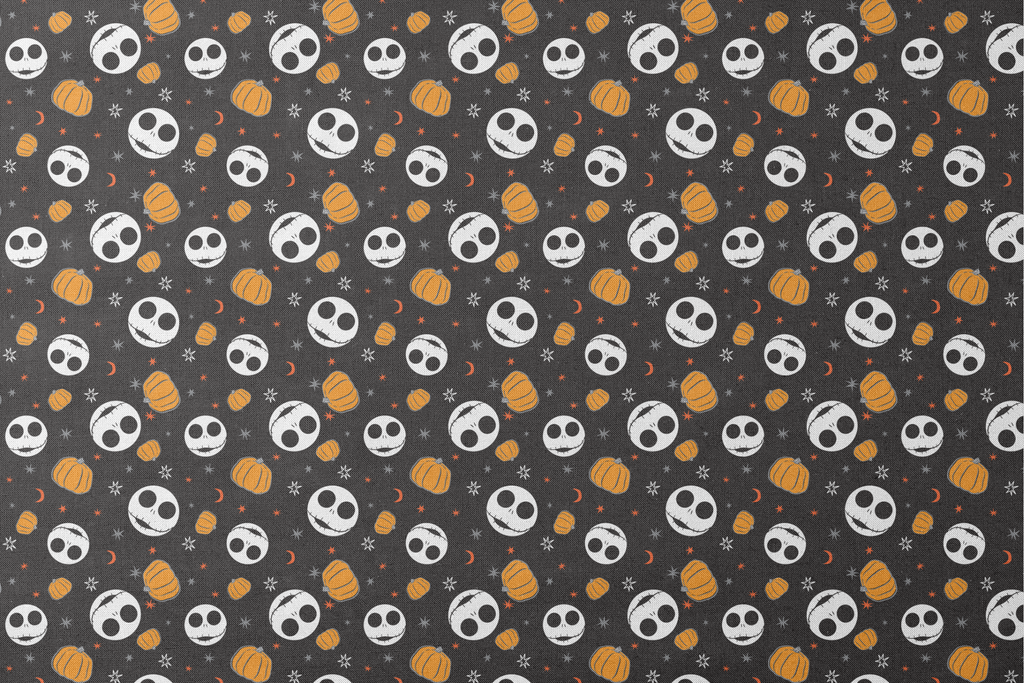 Spooky Halloween pattern featuring Disney Tim Burton's The Nightmare Before Christmas characters, moons, and stars on a black background - perfect for seasonal holiday decor or apparel.