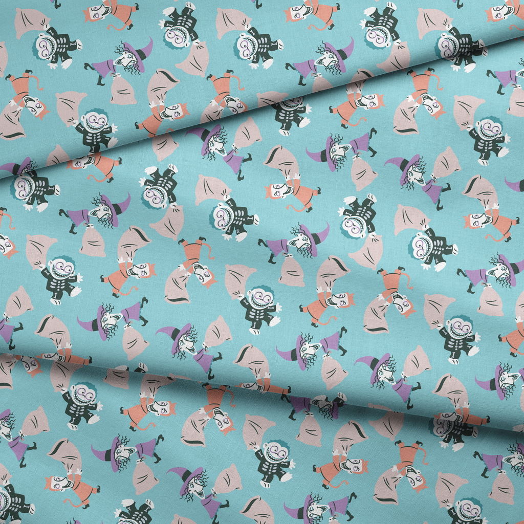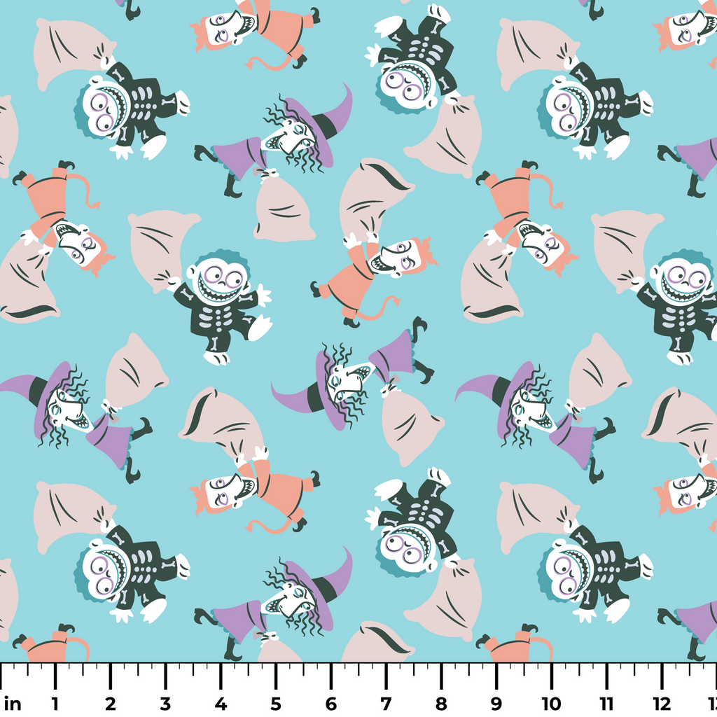 Disney Tim Burton's The Nightmare Before Christmas characters Lock, Shock, and Barrel dance across a cheerful light blue background in this whimsical Halloween-themed pattern featuring purple witches and orange ghosts.