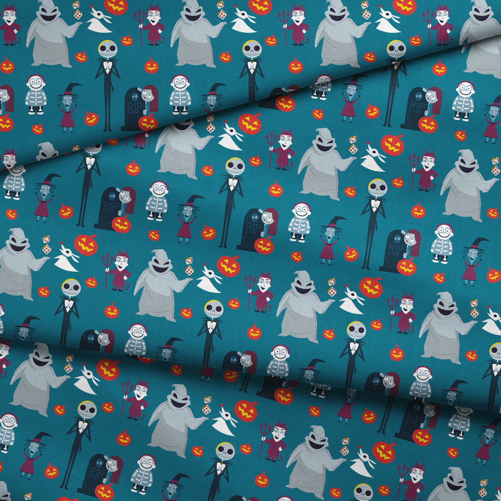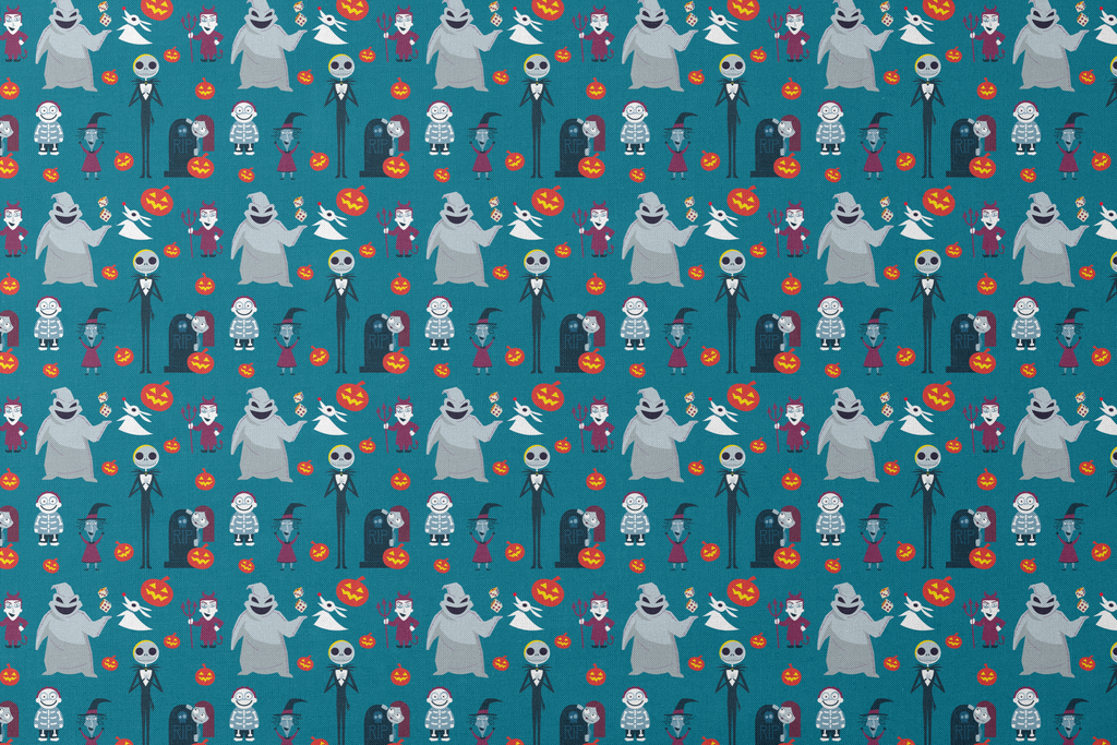 Spooky Halloween pattern featuring iconic characters like Disney's Oogie Boogie and Jack Skellington on a teal background with orange pumpkins, perfect for creepy holiday celebrations.