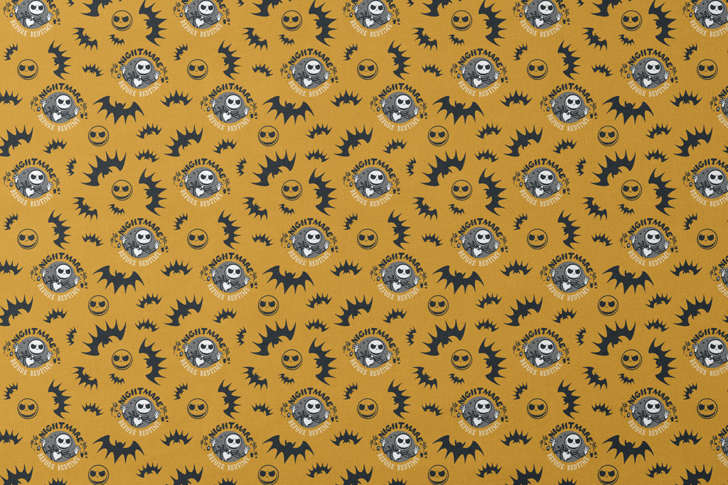 Classic Disney Tim Burton's The Nightmare Before Christmas pattern with skull characters, bats, and jack-o-lanterns on a vibrant orange background. Perfect for Halloween decor or spooky season apparel.