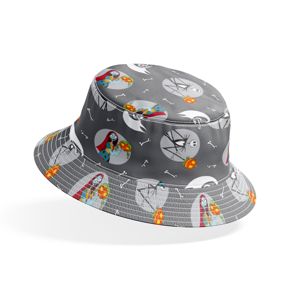 Spooky Disney Tim Burton's The Nightmare Before Christmas-inspired pattern featuring Sally and Jack and ghostly motifs on a gray background - perfect for Halloween decor or gothic home accessories.