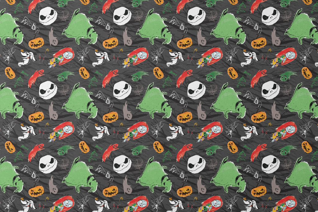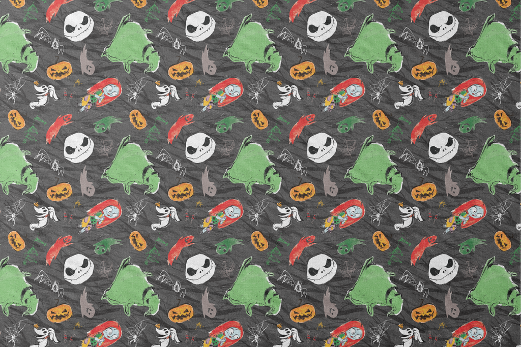 Spooky Halloween print featuring Disney's Jack Skellington's grinning face, alongside festive ghosts, pumpkins, bats and green witches on a dark background with cobweb accents.