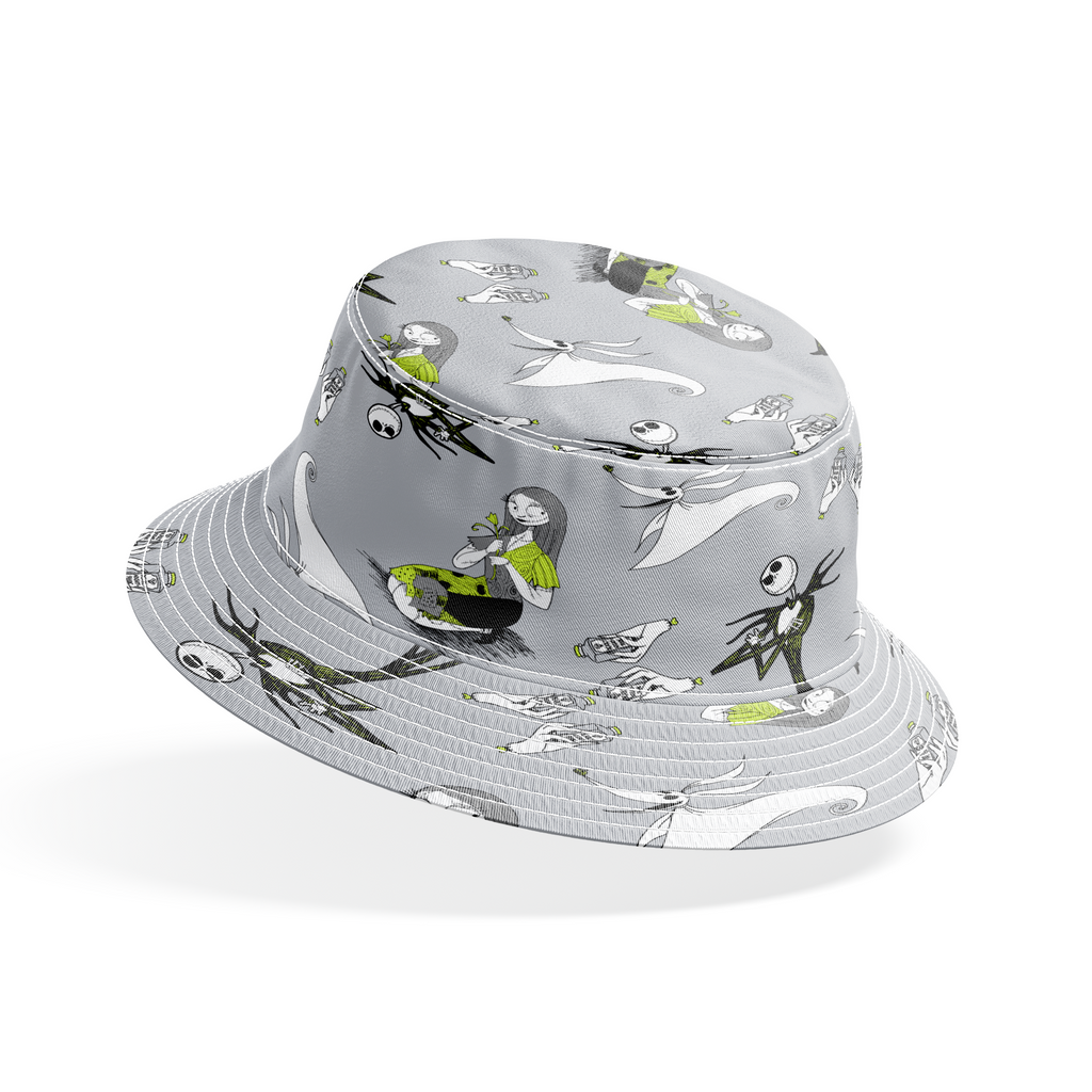 Spooky, whimsical Disney Tim Burton's The Nightmare Before Christmas featuring skeletal figures, ghostly apparitions, and eerie elements in a minimalist style with a monochromatic gray palette accented by lime green highlights.