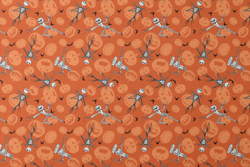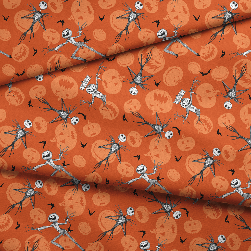 Spooky Disney Tim Burton's The Nightmare Before Christmas pattern featuring Disney's Jack Skellington dancing across an orange background with jack-o'-lantern silhouettes and bats, perfect for holiday decor or festive crafting.