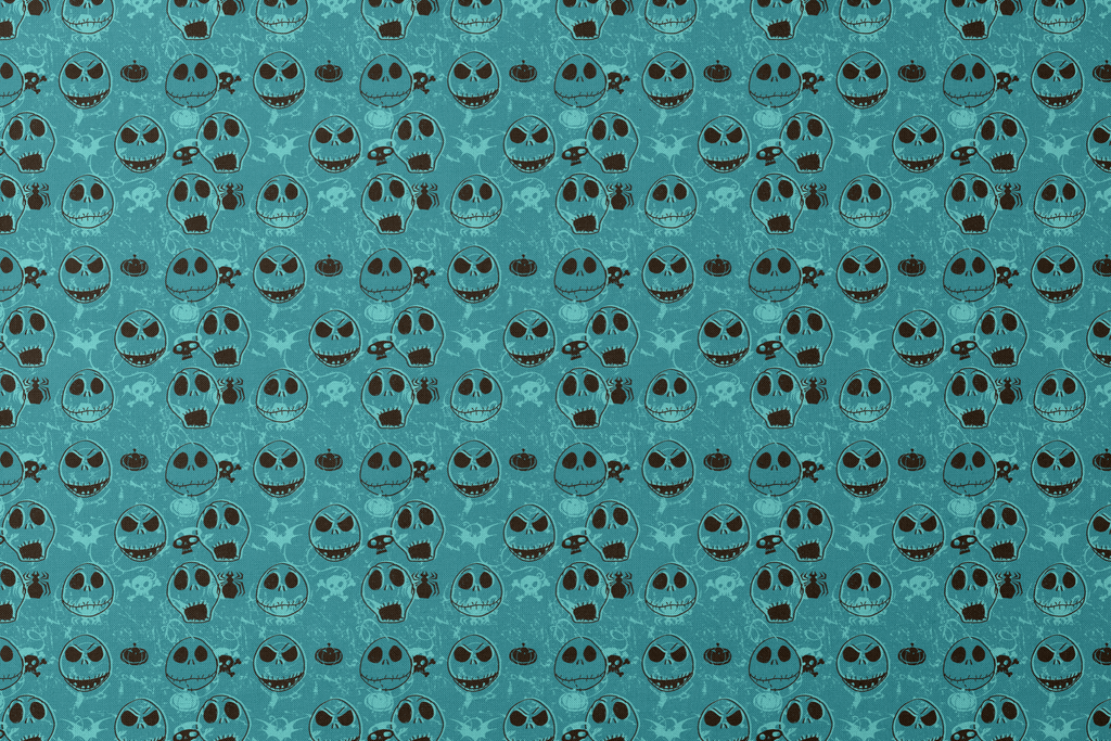 Spooky teal pattern featuring Disney Tim Burton's The Nightmare Before Christmas, Jack Skellington, with varying expressions, perfect for Halloween decor or gothic apparel. Includes creepy elements like spiders, bats, and pumpkins on a distressed background.