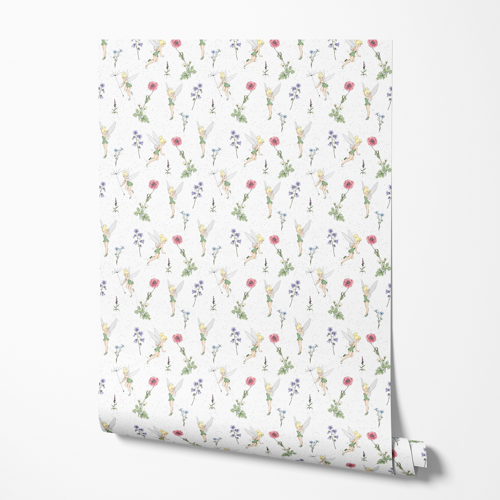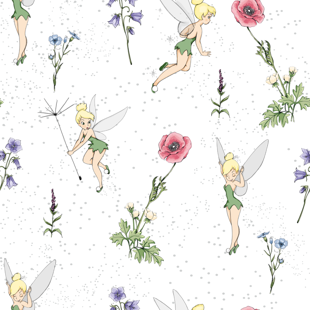Enchanting Disney Tinker Bell pattern featuring floral botanicals and Tinker Bell amidst wildflowers, poppies, and lavender on a subtle speckled white background. Perfect for nurseries and kids' rooms.