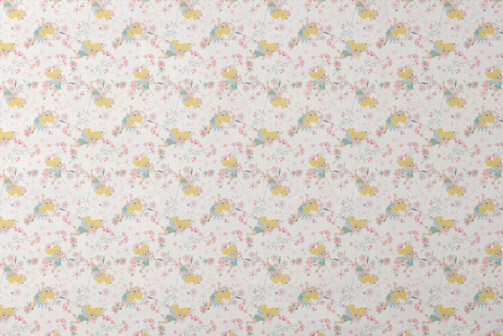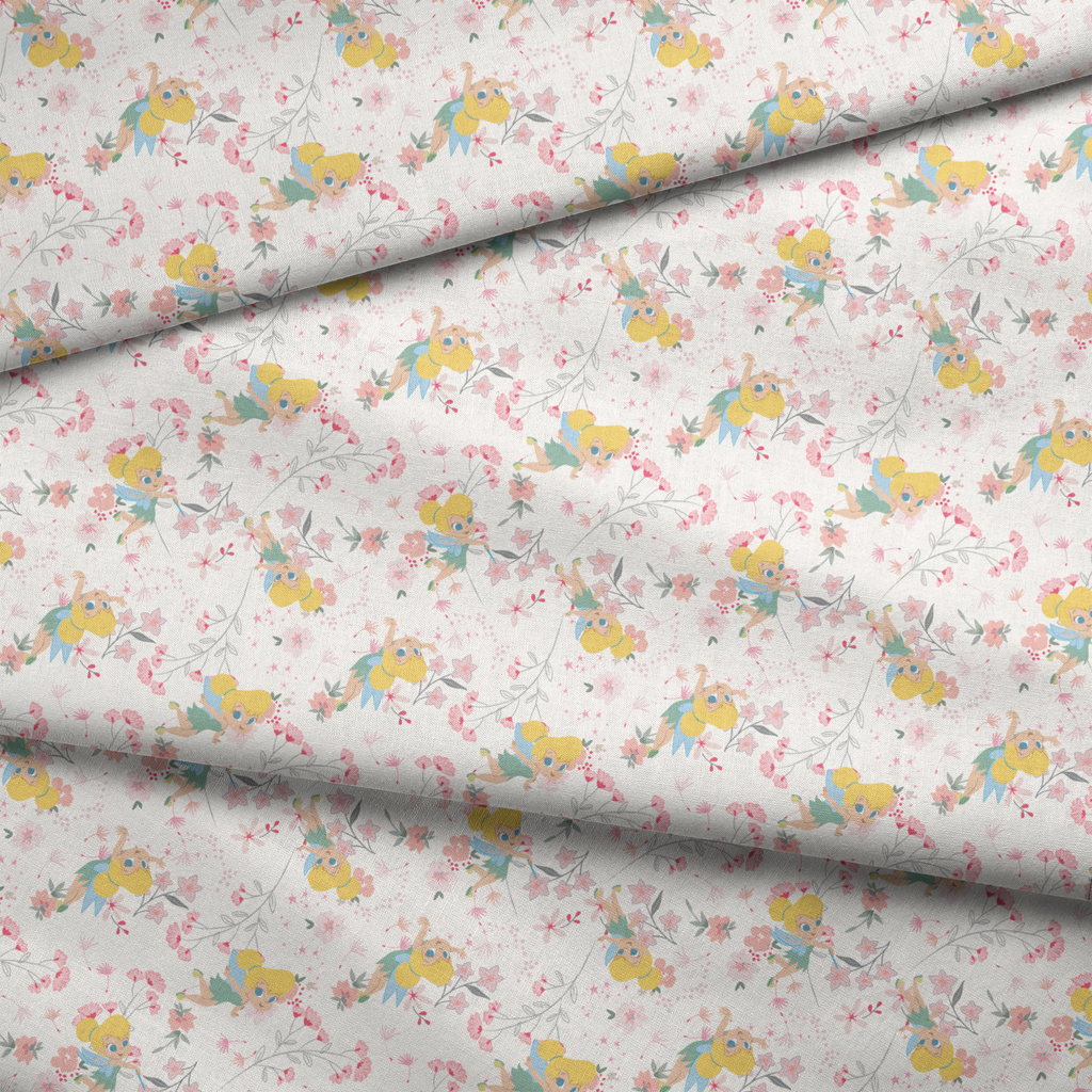 Whimsical Tinker Bell frolics among delicate pink florals in this cheerful pattern, perfect for children's apparel or nursery decor. The pastel color palette creates a playful, vintage-inspired design.
