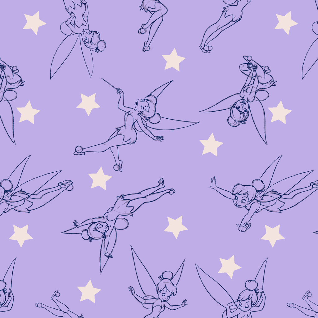 Whimsical Tinker Bells dance across a lavender background adorned with scattered white stars, creating a magical pattern perfect for children's apparel or nursery decor.