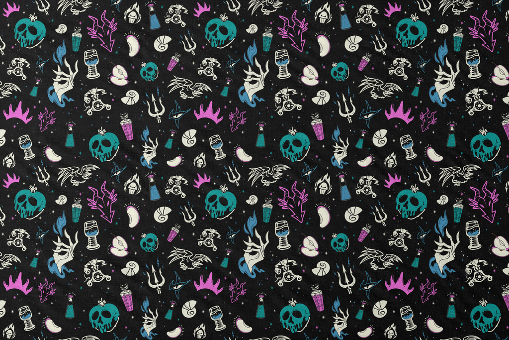 Gothic black pattern with villainous icons like skulls, potions, and flames in teal, purple, and blue. Perfect for Halloween decor or bold fashion.